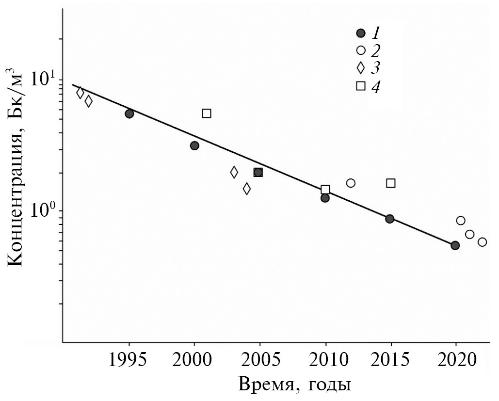 Рис. 1. Динамика 137Cs в воде Онежского озера, Бк/м3: 1 – данные расчета по (1), (3); 2 – данные опыта авторов статьи; 3 и 4 – данные озер сравнения – Инари [18] и Имандра [12, 13]