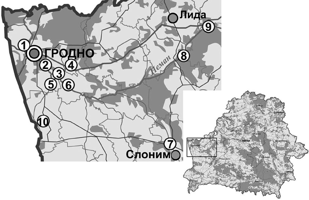 Рис. 1. Створы отбора проб на реках бассейна Немана (1 – р. Неман; 53.761538 с.ш.; 23.81058 ю.д.); 2 – р. Неман; 53.6395 с.ш.; 23.9822 ю.д.); 3 – р. Котра (53.5621 с.ш.; 24.0770 ю.д); 4 – р. Скиделянка (53.6065 с.ш.; 24.2255 ю.д.); 5 – р. Неман (53.5128 с.ш.; 24.0755 ю.д.); 6 – р. Неман (53.4723 с.ш.; 24.2403 ю.д.); 7 – р. Щара (53.1176 с.ш.; 25.3000 ю.д.); 8 – р. Неман (53.8650 с.ш.; 25.7462 ю.д.); 9 – р. Неман (53.6714 с.ш.; 25.4432 ю.д.); 10 – р. Берестовичанка (53.1884 с.ш.; 23.9572 ю.д.)