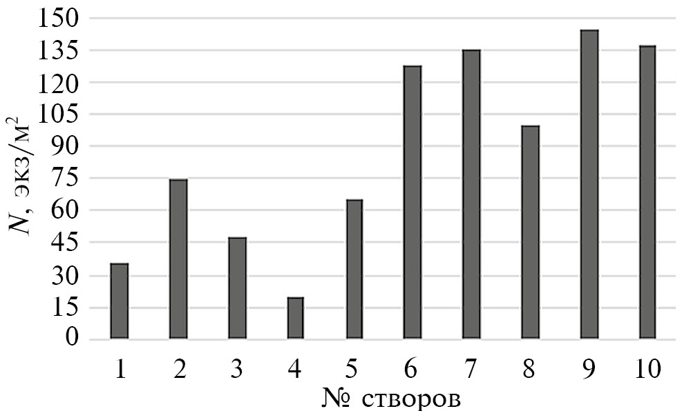 Рис. 2. Численность N макрозообентоса на изученных створах в летний период