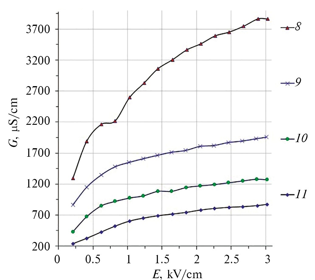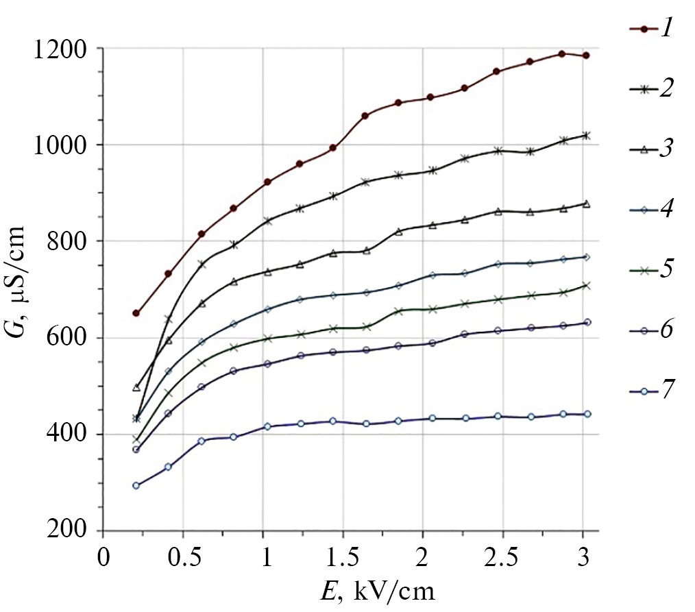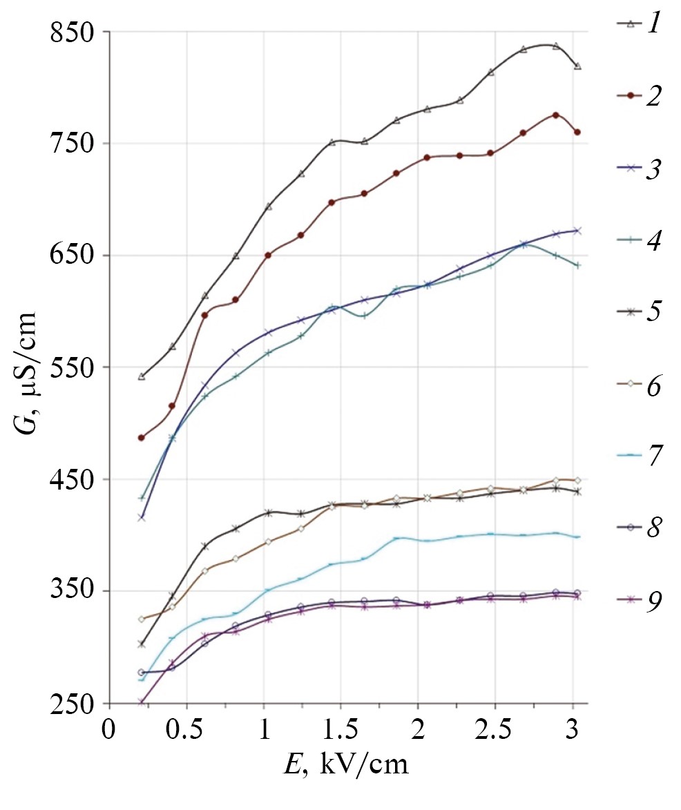 Исследования проводимости природной воды выполнены в ИЭПВН методом и аппаратурой кондуктометрии с погрешностью ≤3.5% в диапазоне 0...3 кВ/см [17]. Все измерения проводимости образцов воды выполнены при температуре +25±0.5°С. Для этого использован термостабилизированный столик, а температурная погрешность измеренной проводимости была ≤2% [13]. Учитывая то, что температурная зависимость проводимости разбавленных водных растворов незначительна и линейна (в данном диапазоне) [1, 2, 13], ее влиянием на нелинейные процессы в ИЭПВН можно пренебречь.
