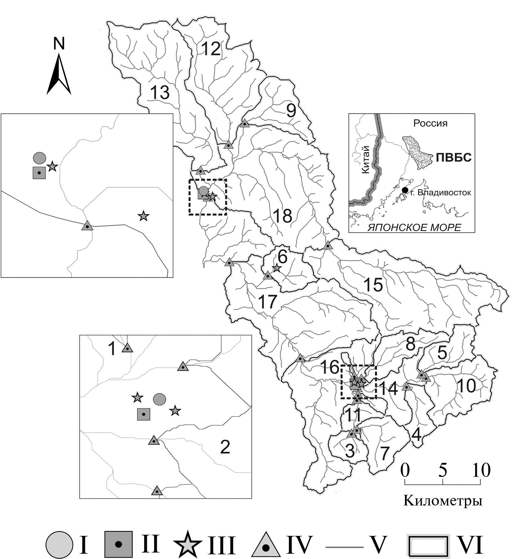 Рис. 1. Картосхема исследуемой территории: I – метеостанция, II – водный испаритель, III – почвенно-испарительный полигон, IV – гидрологический пост и осадкомер, V – речная сеть, VI – граница водосборов; номера на карте соответствуют нумерации в табл. 1