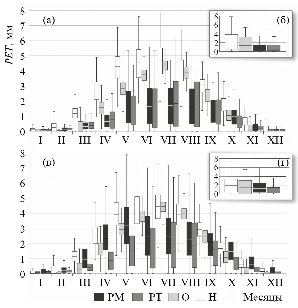 Рис. 3. Результаты обобщения среднемесячных (а, в) и годовых (б, г) значений PET, вычисленных с помощью разных методов за полный период моделирования по данным метеостанций Приморская (а, б) и Тимирязевский (в, г)