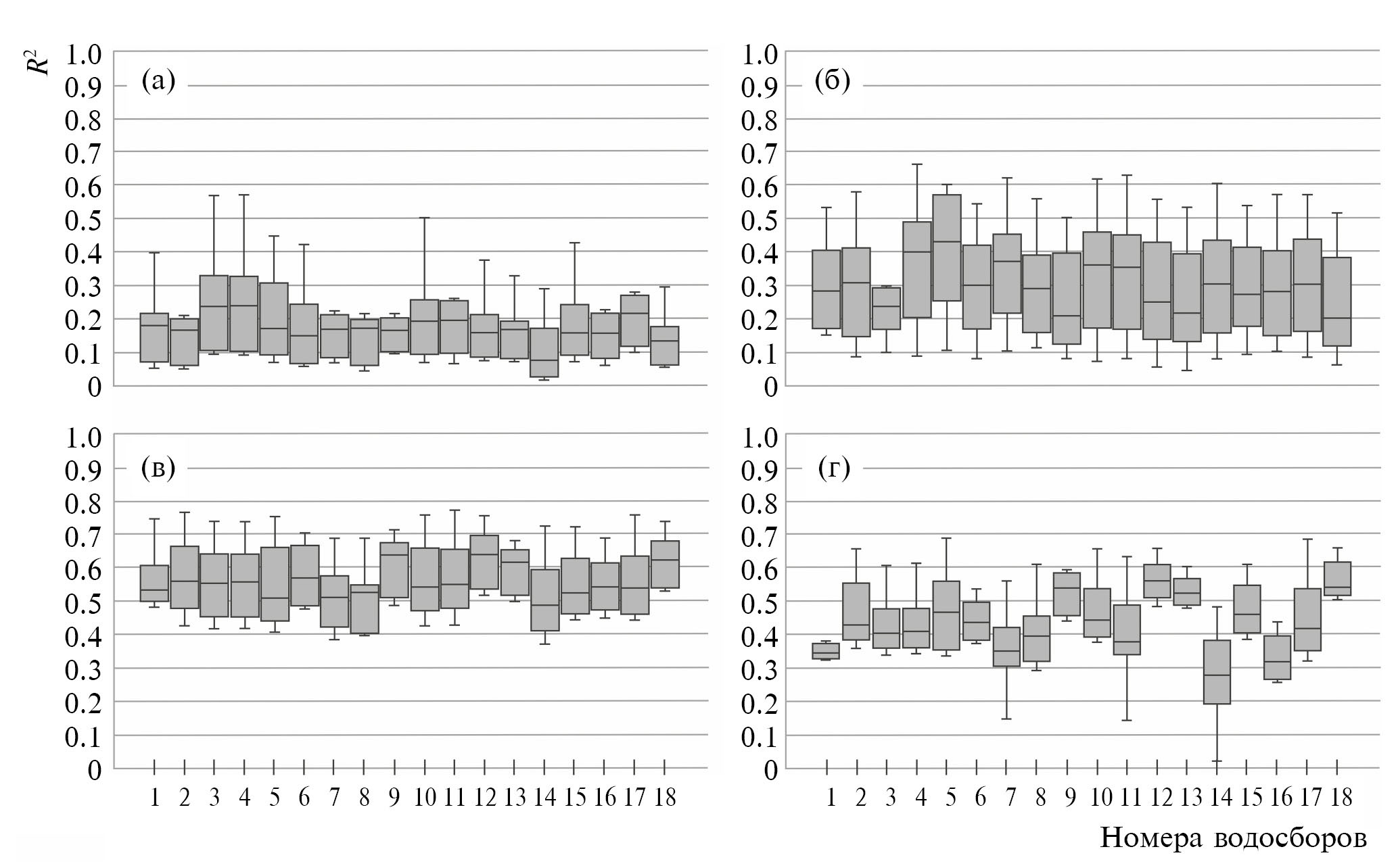 Рис. 4. Корреляция модельных значений действительного испарения AET, рассчитанного с использованием различных методов PET для 18 водосборов (номера согласно табл. 1), и данных почвенных испарителей ПВБС за период май–октябрь (1973–1987 гг.): а – Пенмана-Монтейса; б – Пристли–Тэйлора; в – Одина; г – Харгривза