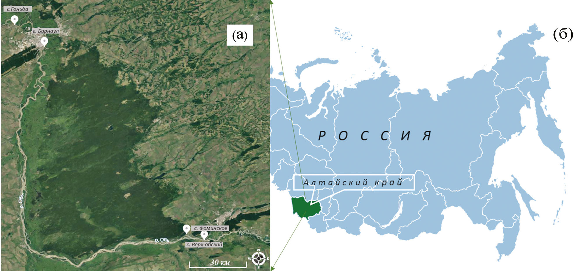 Водный режим на изучаемом участке реки формируется за счет снегового и ледникового питания, грунтовых вод и летних атмосферных осадков [7]. Среднегодовое количество осадков 433 мм, из которых ~ 65% выпадает в теплый период года [5]. Распределение осадков внутри года, благодаря близости гор, более равномерное, чем в остальных районах Приобской лесостепи, несколько увеличенное в летний период [4]. На равнинной территории Алтайского края в пределах водосборной площади Оби от г. Бийска (с. Верх-Обское 52°26.54′ с.ш. 84°53.41′ в.д.) до г. Барнаула (п. Гоньба 53°20. 84′ с.ш. 83°46.74′ в.д.) среднегодовое количество осадков за изучаемый период менялось в интервале 425–453 мм [3]. Ледостав обычно устанавливается к середине ноября и сохраняется на протяжении 5 мес. Толщина ледового покрова на реке к концу зимнего периода достигает 0.9–1.1 м. В середине апреля (самые ранние сроки – первая декада апреля) происходит вскрытие Оби и начинается ледоход. Гидрограф Оби характеризуется растянутым весенне-летним половодьем, в котором можно выделить две волны, и низкой устойчивой осенней и зимней меженью. В период половодья на изучаемом участке Оби проходит до 70–80% объема годового водного стока [13, 15]. Первая волна половодья, связанная с таянием снегов на поверхности равнинного участка водосбора реки, проходит с конца апреля. На ее долю приходится 15–20% общего объема стока за весь период половодья. Воды первой волны половодья в значительной степени аккумулируются в русле Оби, редко выходя на пойму. Во время второй основной волны, наступающей в мае–июне и связанной с таянием снежного покрова и ледников в предгорьях и горах истоков Оби, наблюдаются максимальные уровни и затопление поймы на срок до 2–3 мес. [2].