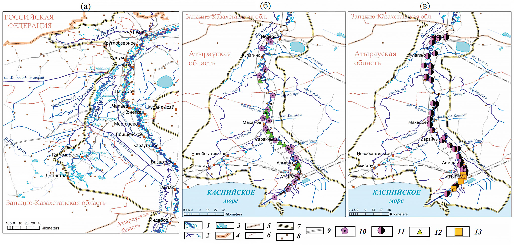 Рис. 1. Казахстанский участок р. Урал с пойменно-старичным комплексом, населенными пунктами, водозаборами и каналами, дорожной сетью. 1 – р. Урал и канал Кушум с пойменно-старичным комплексом (а), 2 – каналы и притоки, 3 – водоемы, 4 – государственная граница, 5 – граница между областями, 6 – граница между районами, 7 – границы бассейна р. Урал, определенные авторами, 8 – населенные пункты, 9 – транспортная инфраструктура; тип водозабора (рис. б и в): 10 – подача насосной станцией в канал, 11 – водоснабжение сельских поселений, 12 – сельхозпредприятий, 12 – городов и крупных промышленных предприятий.