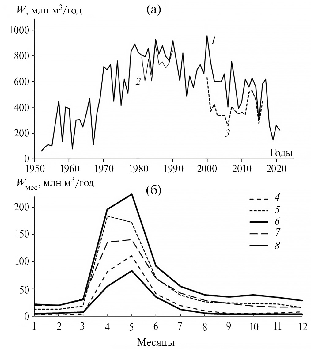 Рис. 2. Многолетний (а) и внутригодовой (б) режим забора уральских вод в Кушумский канал. По данным: 1 – гидрологических ежегодников [5, 6] и Казгидромета, 2 – [7], 3 – Западно-Казахстанского филиала “Казводхоза”; периоды: 4 – 1955–1969, 5 – 1970–1977, 6 – 1978–1993, 7 – 2002–2017, 8 – 2018–2021 гг.