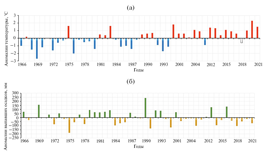 Рис. 1. Динамика аномальных значений среднегодовых значений температуры воздуха (а) и среднегодовых осадков (б) от нормы за период 1966–2021 гг., п. Акъяр, Республика Башкортостан.