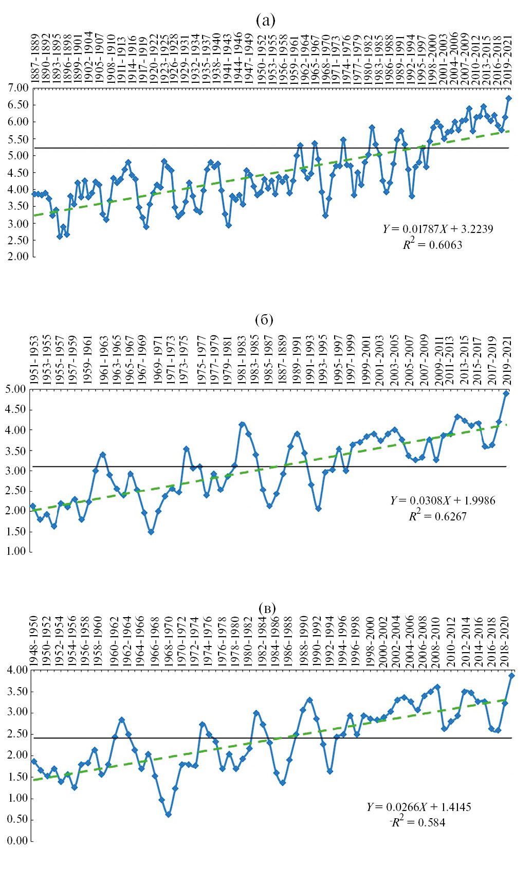 Рис. 2. Анализ трехлетних скользящих среднегодовых значений температуры воздуха за периоды 1887–2021 гг. г. Оренбург (а), 1951–2021 гг. п. Акъяр (б), 1948–2020 гг. г. Магнитогорск (в).