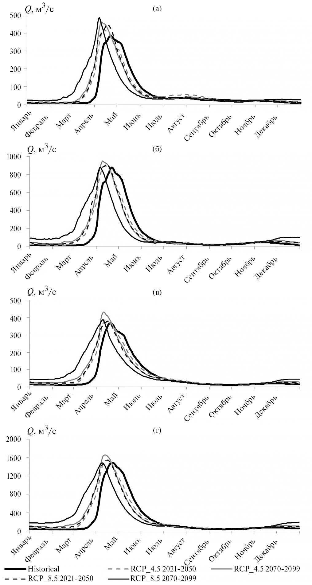 Рис. 2. Приток воды в Ириклинское водохранилище (а), сток р. Сакмары (б) и р. Урал у г. Оренбурга (в) и в приграничном створе ниже впадения р. Илек (г) в среднем за 2021–2050 и 2070–2099 гг. согласно RCP 4.5 и RCP 8.5 и 1976–2005 гг. (“historical”).