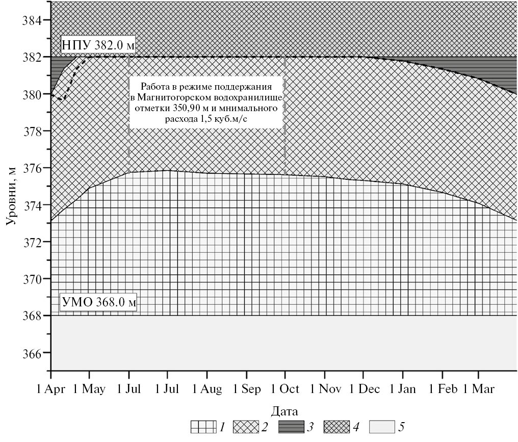 Рис. 3. Проект диспетчерского графика Верхнеуральского водохранилища. 1 – зона неиспользуемого объема; 2 – зона сниженной отдачи: 1.9 м3/с IV–X, 3 м3/с XI–III; 3 – зона гарантированной отдачи 7 м3/с; 4 – зона повышенной отдачи 30 м3/с; 5 – зона полной пропускной способности.