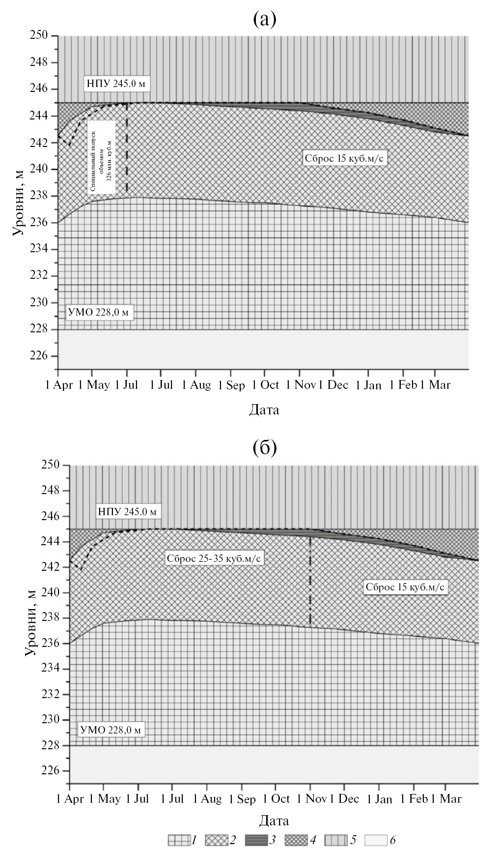 Рис. 4. Варианты диспетчерского графика Ириклинского водохранилища: а – осуществление спецпопуска объемом 326 млн м3; б – с апреля по октябрь расход 25–35 м3/с, зоны: 1 – неиспользуемого объема; 2 – сниженной отдачи 15 м3/с; 3 – гарантированной отдачи 22.9 м3/с, 4 – повышенной отдачи 35 м3/с; 5 – полной загрузки ГЭС; 6 – полной пропускной способности.