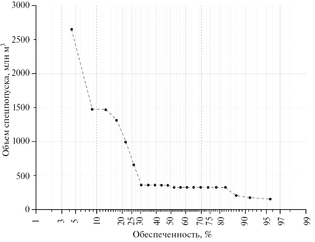 Что касается показателей специального попуска во втором варианте регулирования, то, согласно рис. 5, обеспеченность его принятого объема 326 млн м3 составляет 83%, что укладывается в диапазон нормативной обеспеченности требований рыбного хозяйства 75–90% [8].