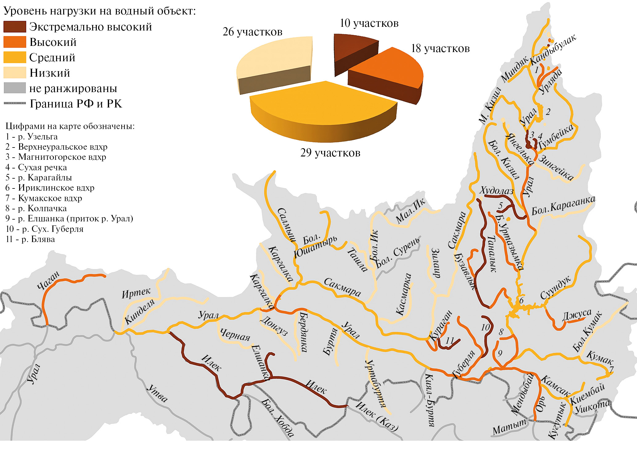 К водным объектам с высоким уровнем нагрузки отнесены реки Урляда, Узельга, Большая Уртазымка, Бузавлык, Джуса, Елшанка (приток р. Урал), Колпачка, Губерля, Орь, Чаган, Кураганка, участки р. Урал в пределах и ниже городов Магнитогорска, Орска, Новотроицка, Оренбурга, участок р. Сакмары в Оренбурге, а также оз. Большое Учалы.