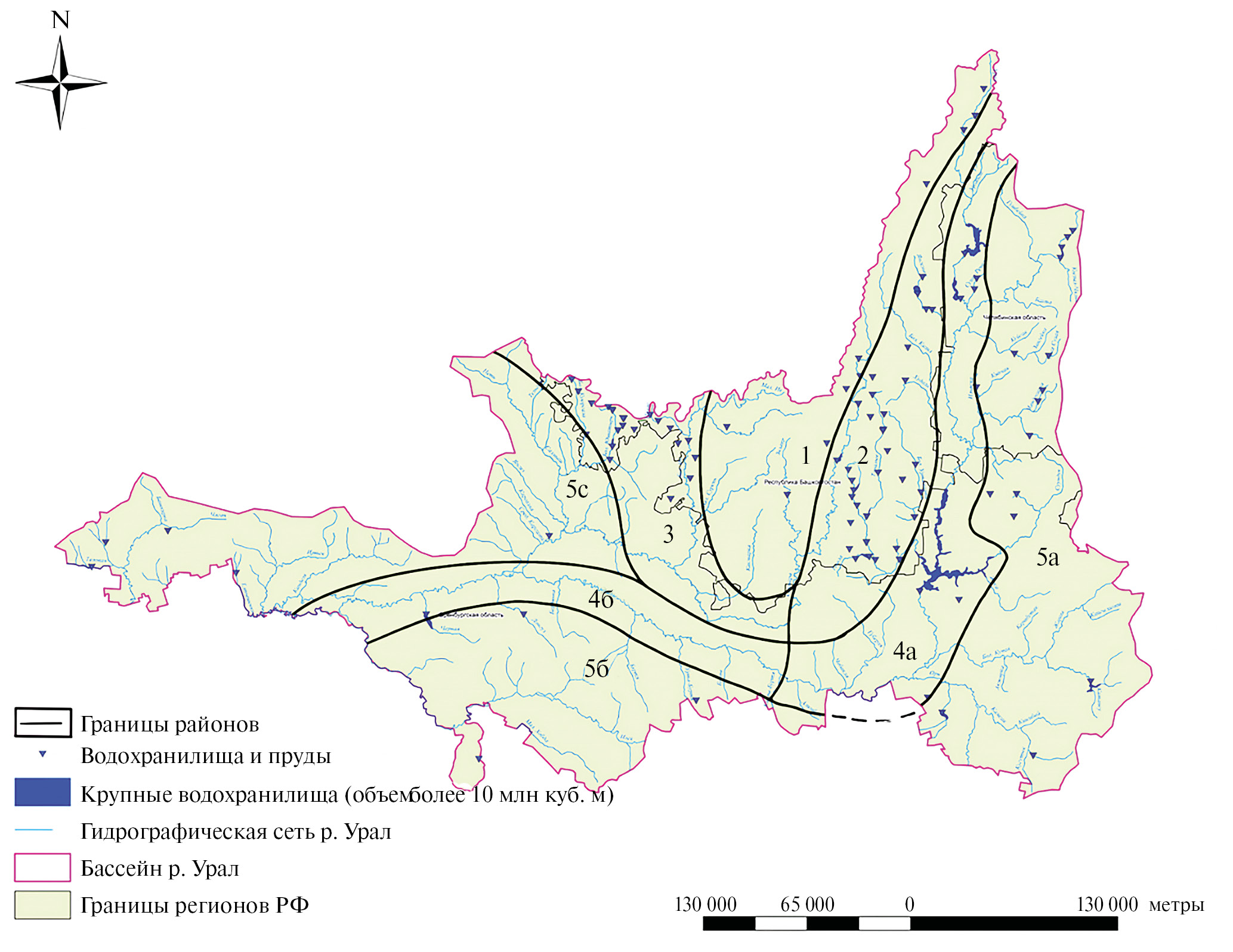 Рис. 1. Районирование бассейна р. Урал в пределах Российской Федерации по степени и видам преимущественного влияния хозяйственной деятельности на малые реки.
