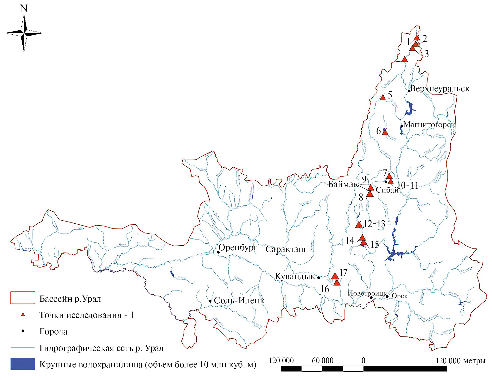 Расположение участков, на которых проводились комплексные изыскания и исследования, показаны на рис. 2. К ним относились: р. Урал – 300 м выше д. Рысаево (участок 1), руч. Безымянный – выше д. Бурангулово (2), р. Бирся – 2.2 км выше д. Калканово (3), р. Урал – 2.5 км выше д. Уразово (4), р. Малый Кизил – 3.9 км выше с. Новоабзаково (5), р. Янгелька – д. Давлетово (6), р. Худолаз – д. Казанка (7), р. Таналык – ниже г. Баймак (8), Р. Таналык – выше г. Баймак (9), р. Худолаз – д. Калинино (10), р. Карагайлы – устье (11), р. Бузавлык – выше сброса сточных вод из карьера “Юбилейного” (12), р. Бузавлык – ниже сброса сточных вод (13), р. Таналык – выше пос. Бурибай (14), р. Таналык – ниже сброса сточных вод (15), р. Блява – выше г. Медногорск (16), р. Блява – ниже сброса сточных вод Медногорским ГОК в створе д. Бляватамак (17).