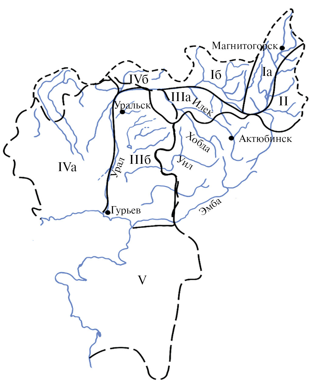 Рис. 2. Районирование бассейна р. Урал по внутригодовому распределению стока [11].