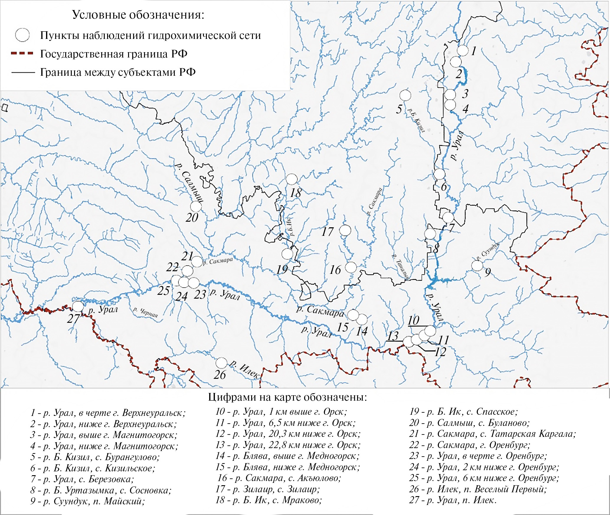 Для исследования многолетних тенденций содержания загрязняющих веществ в речной системе р. Урал сформирована база данных гидрохимического мониторинга на 27 пунктах наблюдений Росгидромета за период с 1986 (в нескольких створах с 1969 г. или 1971 г.) по 2021 г. для различных показателей качества воды. Картосхема расположения гидрохимических постов в бассейне р. Урал приведена на рис. 1.