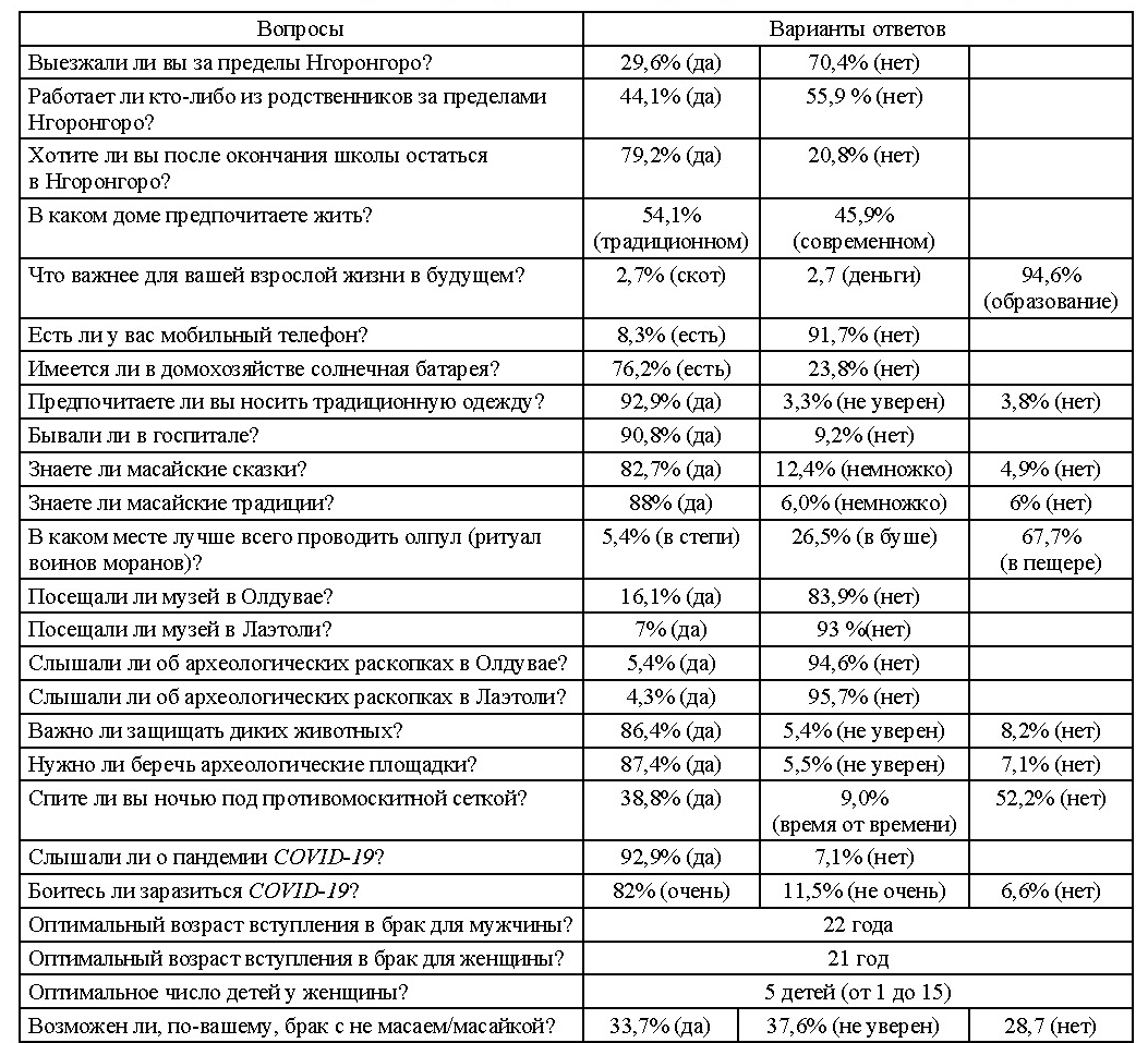 Проведенные опросы среди молодых масаев Нгоронгоро показали, что эта наиболее продвинутая часть местной молодежи характеризуется специфическим сочетанием традиционных и современных установок в отношении личных планов на будущее, доступа к современным техническим средствам, приверженности традиционным установкам и тенденциям к размыванию стереотипов репродуктивного и брачного поведения, информированности о средствах защиты от малярии и ковида (см. табл).