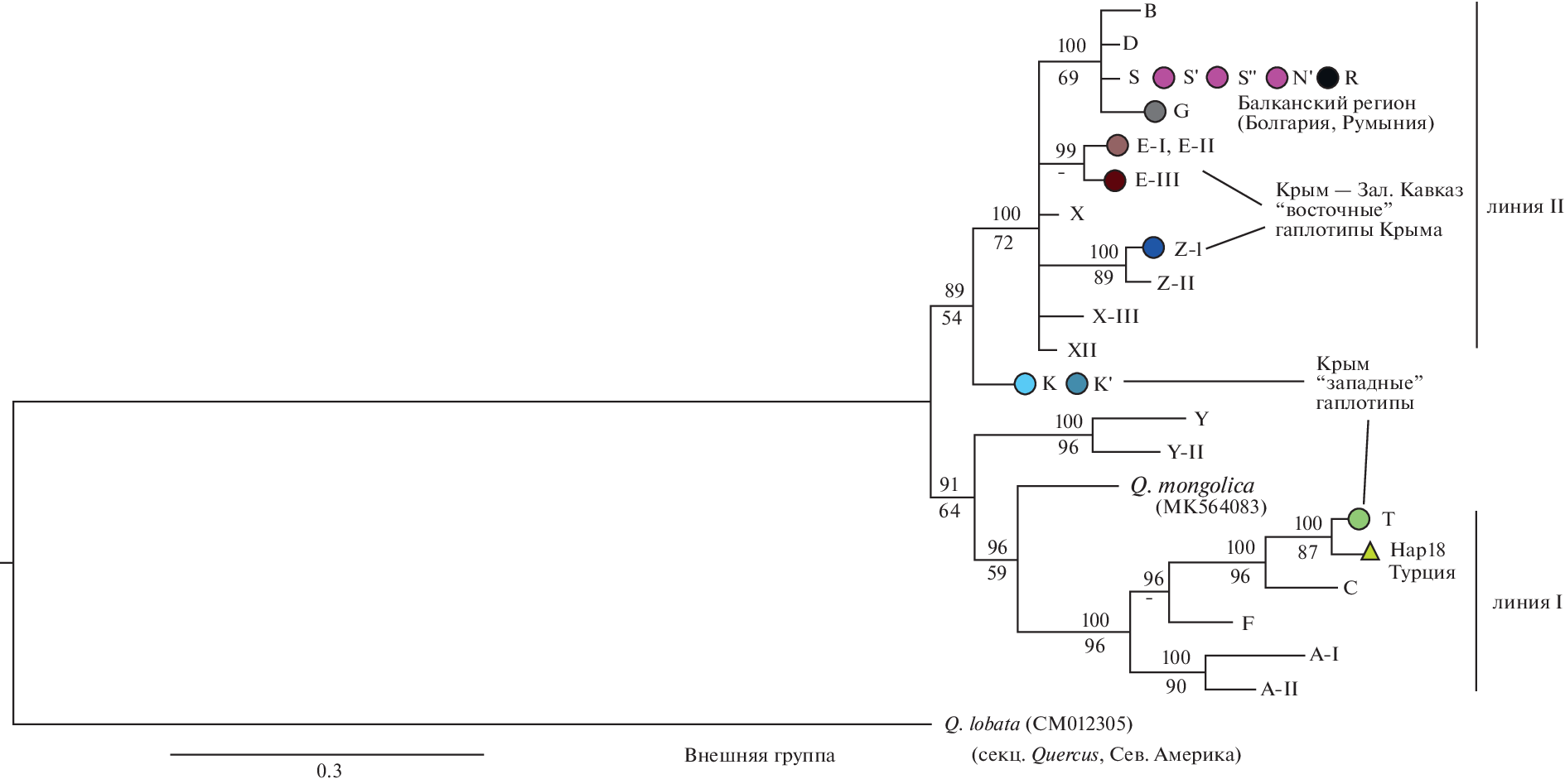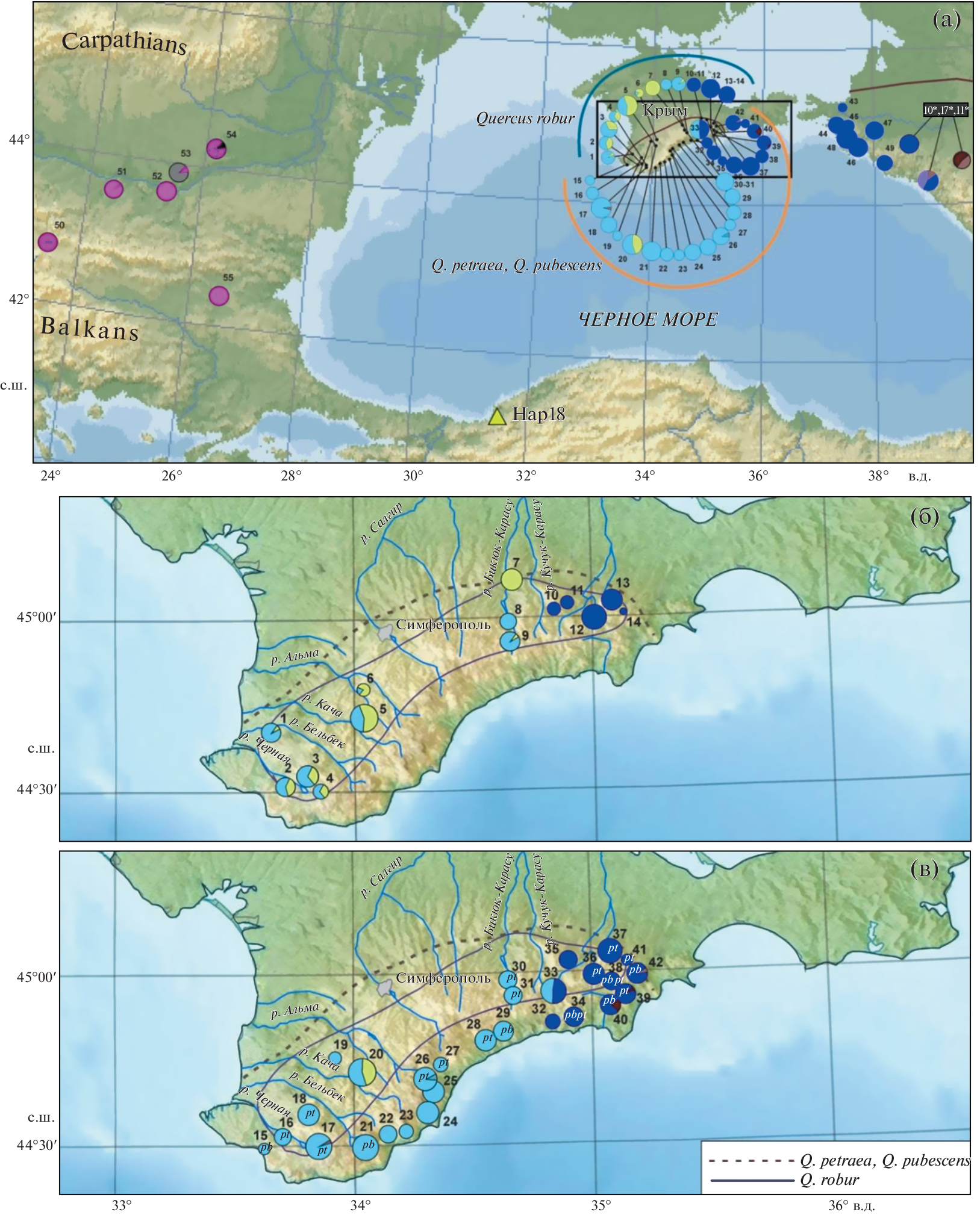 Chloroplast DNA variability was examined in 872 trees of pedunculate oak (Q. robur L.), sessile oak (Q. petraea (Matt.) Liebl.) and downy oak (Q. pubescens Willd.) on the Crimean Peninsula, in the Western Caucasus and in the Balkan region in order to study phylogeography and interaction of these species in the Black Sea region. Sequencing of five fragments with a total length of more than 10,000 base pairs revealed 12 haplotypes of chloroplast DNA. For the haplotype typing in the studied populations, chloroplast microsatellites (cpSSR), sequencing, and restriction analysis were used. Haplotypes detected belong to several divergent phylogenetic lineages. The studied species almost do not differ from each other in the composition of haplotypes and the geographical structure of variability, which demonstrates a certain level of gene flow between them in mixed populations. The haplotypes of the Balkan region are closely related to the haplotypes of previously studied populations from Eastern Europe and the western part of the Russian Plain, and are not found in the Crimea and the Caucasus. On the Crimean Peninsula, two geographical groups of populations are distinguished, which differ sharply in the composition of haplotypes. The difference between the western part of the peninsula and the eastern part is shown, which suggests a multiple origin of oak populations in the Crimea as a result of migrations from two sources, which could be facilitated by fluctuations in the Black Sea level and its desalination, which repeatedly occurred in the Pleistocene and Holocene. The predominance of two divergent haplotypes in the western part of the peninsula, similar to the haplotypes of Asia Minor, indicates the penetration of oak from this region and the presence of an isolated refugium in the mountainous forest regions of Crimea during the last glacial maximum. At the same time, haplotypes common with the Western Caucasus are spread in the east of the mountain-forest part of the Eastern Crimea. The sharp boundary between the areas of distribution of “western” and “eastern” haplotypes in the Eastern Crimea indicates a relatively recent time of the formation of a secondary contact zone between local and Caucasian oak populations as a result of postglacial colonization.