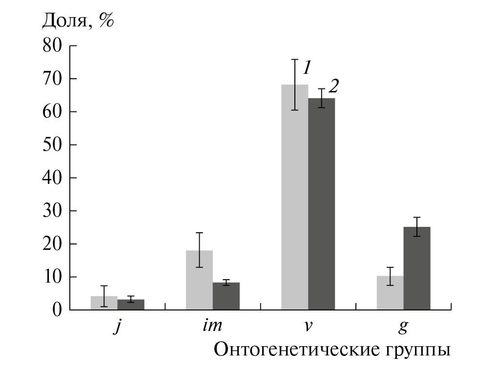 Рис. 3. Усредненные онтогенетические спектры реликтовых популяций Ranunculus kamtschaticus на Среднем Урале (1 – горный массив Денежкин Камень) и Приполярном Урале (2 – г. Баркова). Обозначения онтогенетических групп: j – ювенильная, im – имматурная, v – виргинильная, g – генеративная. Планки погрешностей отражают ошибку среднего значения.
