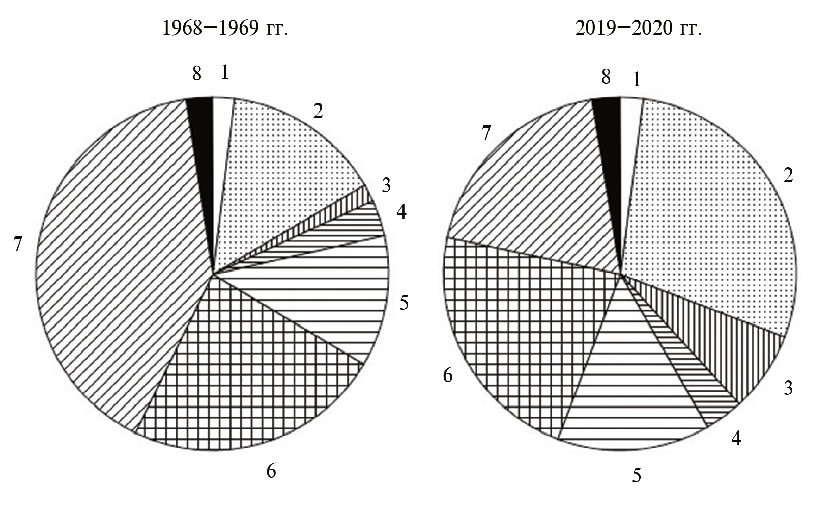 Рис. 3. Состав макрозообентоса оз. Кривое в 1968–1969 и 2019–2020 гг.: 1 – Oligochaeta, 2 – Bivalvia, 3 – Gastropoda, 4 – Megaloptera, 5 – Ephemeroptera, 6 – Chironomidae, 7 – Amphipoda, 8 – прочие