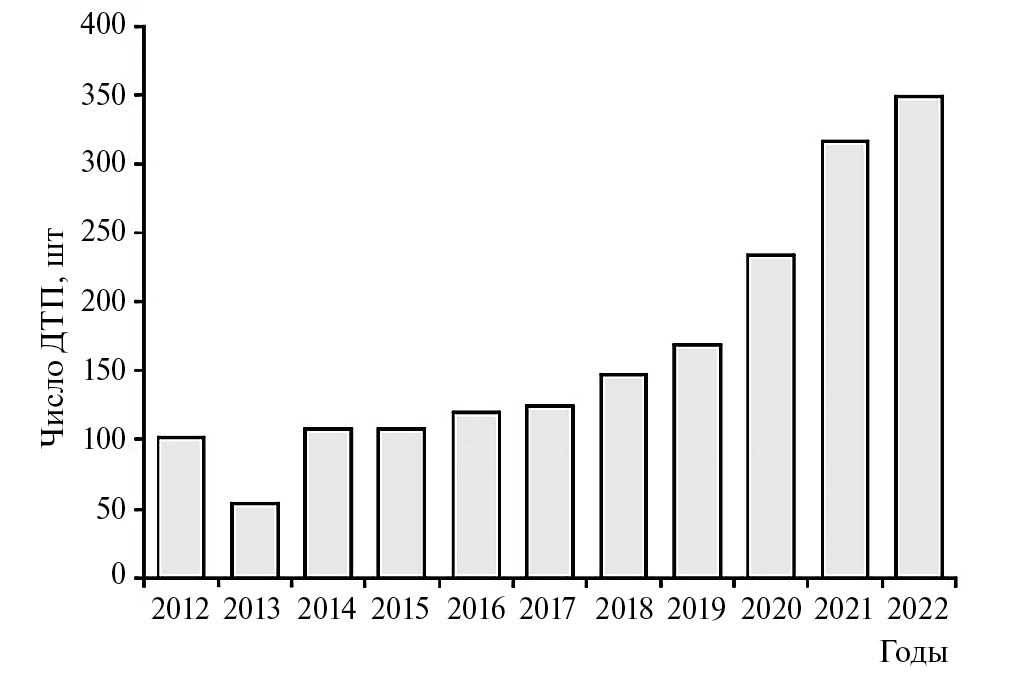Рис. 1. Динамика общего числа ДТП с дикими животными в Свердловской области за период 2012‒2022 гг.