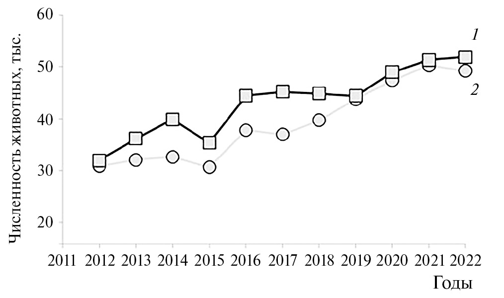 Рис. 4. Изменение численности копытных млекопитающих (1 ‒ лось, 2 ‒ косуля) в Свердловской области в 2012‒2022 гг.