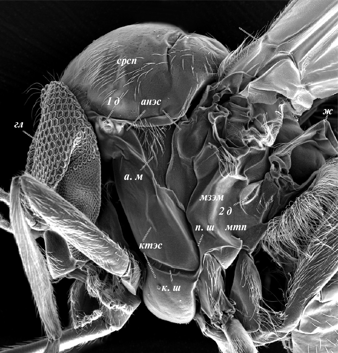 1 д и 2 д — 1-е и 2-е грудные дыхальца, а. м — анэпистернальная мембрана, анэс — анэпистерн, гл — глаз, ж — жужжальце, к. ш — катэпистернальный шов, крл — крыло, ктэс — катэпистерн, мзэм — мезэпимер, мтп — метаплевра, п. ш — плевральный шов, срсп — среднеспинка