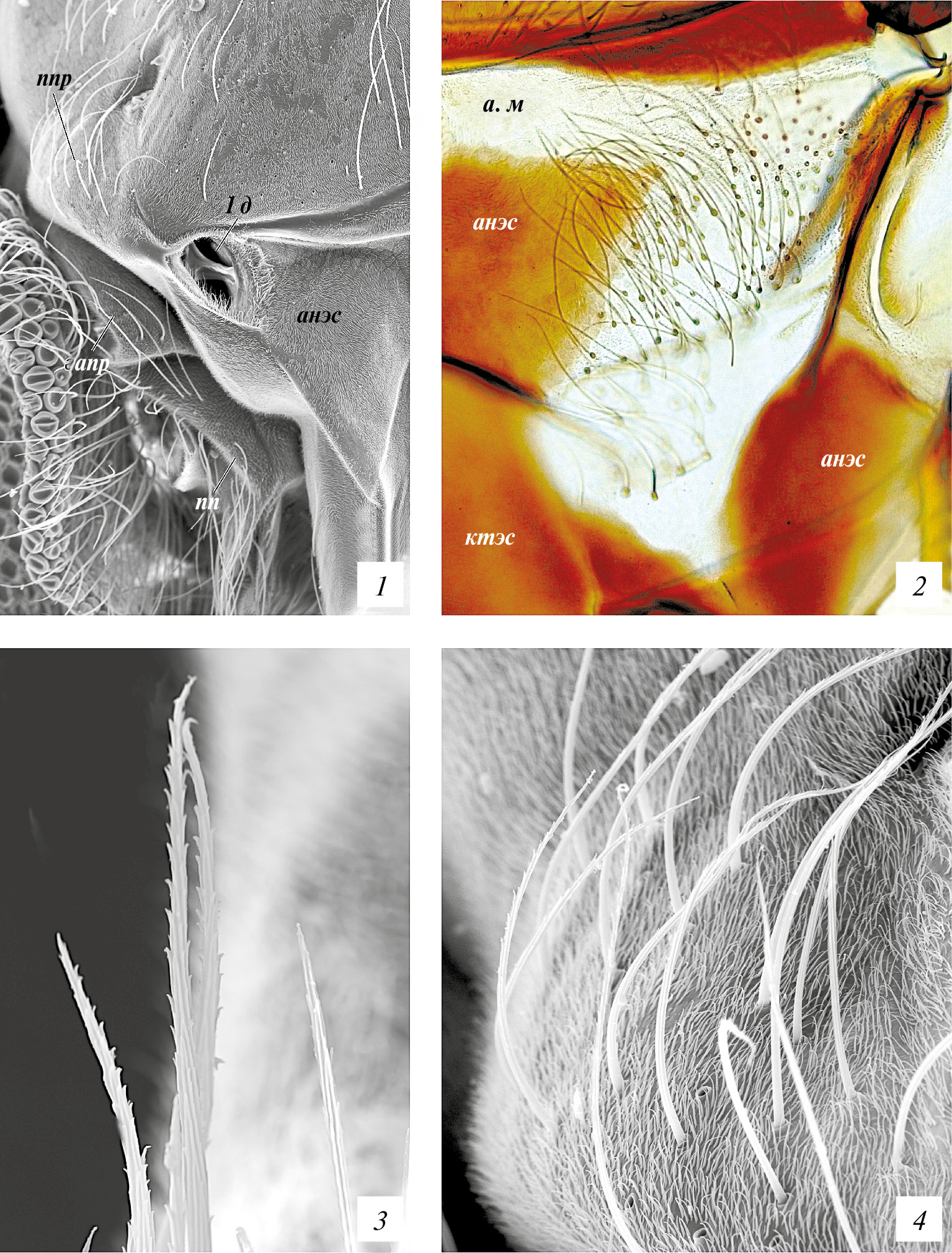 1 – передне- и среднегрудь, ×300; 2 – щетинки анэпистернальной мембраны, постоянный препарат, ×400; 3 – антепронотальные щетинки, ×3200; 4 – постпронотальные щетинки, ×1800