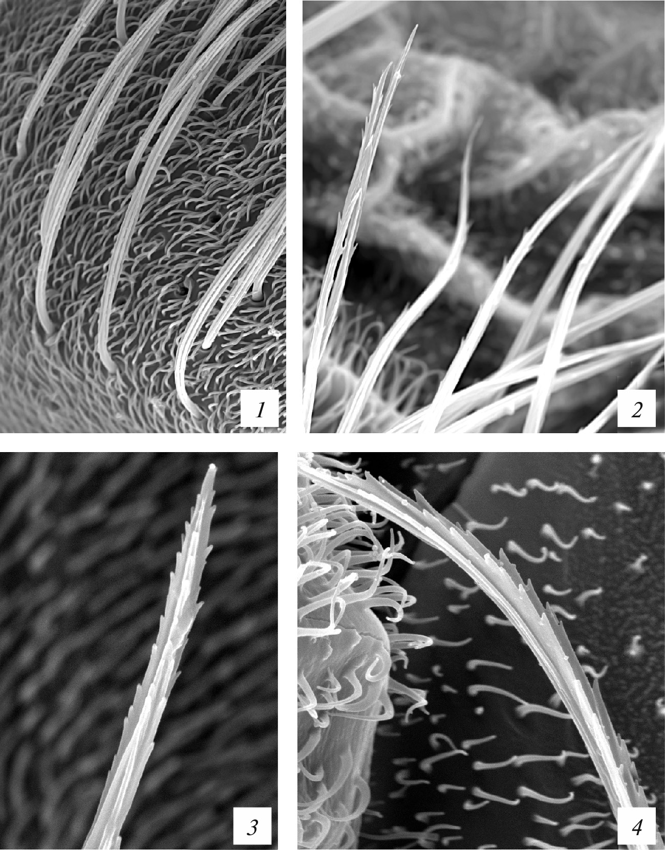 1 – Simulium maculatum (Meigen), постпронотальные чешуйки, ×4200; 2 – Cnephia pallipes (Fries), проплевральные щетинки, ×5100; 3 – Simulium ornatum Meigen, щетинки анэпистернальной мембраны, ×14 500; 4 – Simulium equinum (Linnaeus), мезэпимерные щетинки, ×11 000