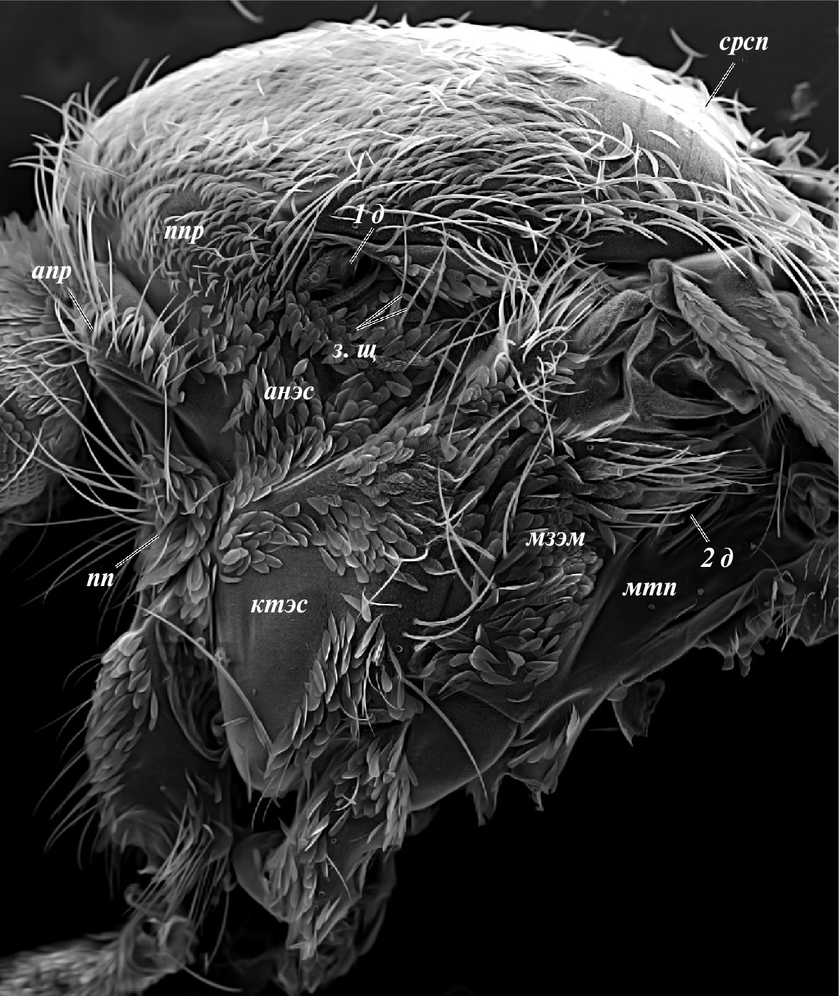 Постпронотальные структуры хетома расположены на большей части поверхности постпронотума и выглядят как модифицированные щетинки с зубчиками (Gymnopais trifistulatus, Prosimulium macropyga, Helodon ferrugineus, Simulium erythrocephalum и S. ornatum, см. рис. 2, 4) или как узкие чешуйки (S. maculatum и S. pusillum, рис. 3, 1). У Gymnopais trifistulatus и Simulium erythrocephalum зубчики едва заметны, тогда как у S. ornatum они видны гораздо лучше. Постпронотальные структуры числом от 20 до 50 есть у всех изученных нами видов.
