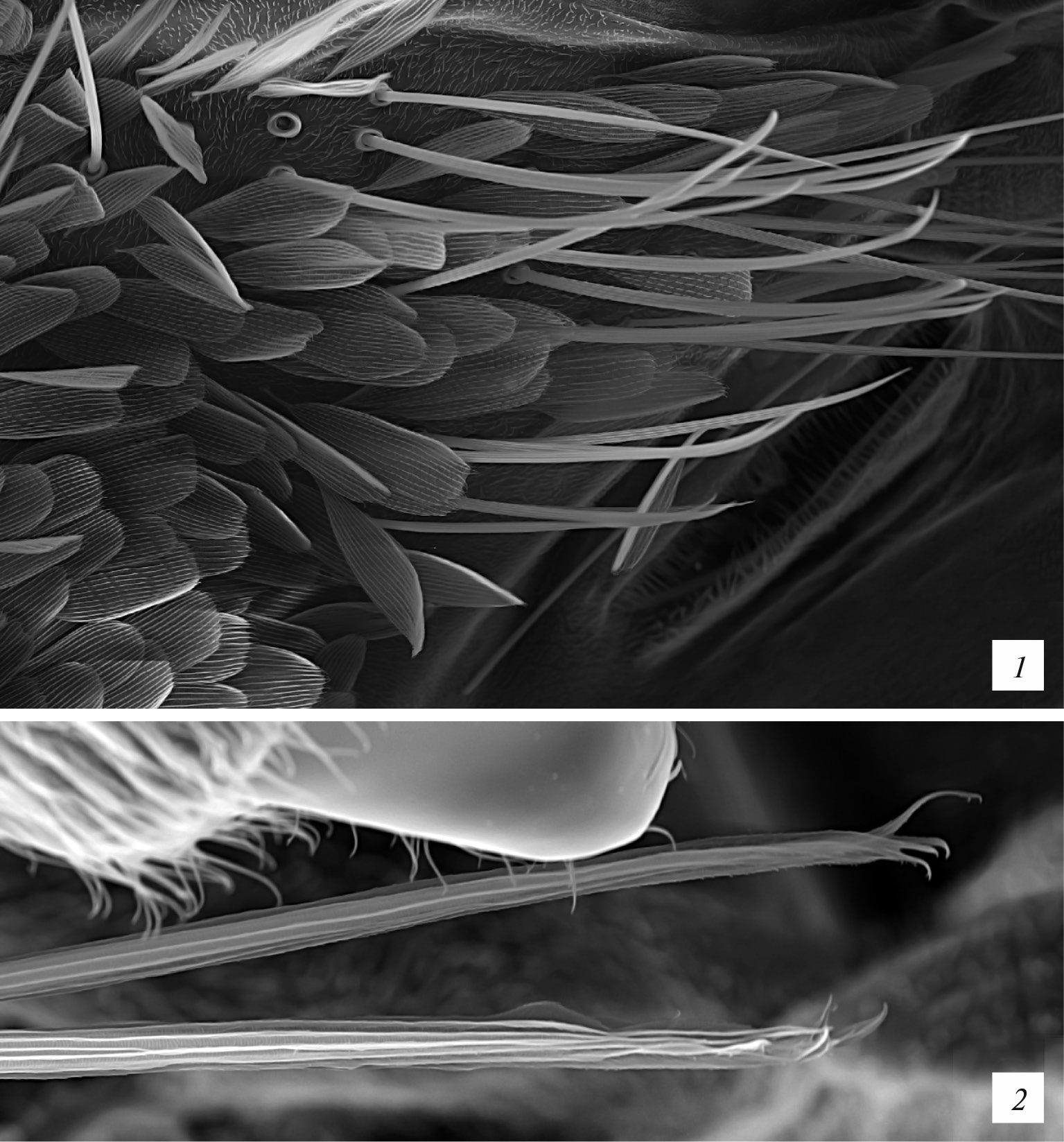 1 – Simulium ornatum Meigen, самец, чешуйки наружной поверхности бедра, ×7700; 2 – Cnephia pallipes (Fries), самка, щетинки I сегмента брюшка, ×6100