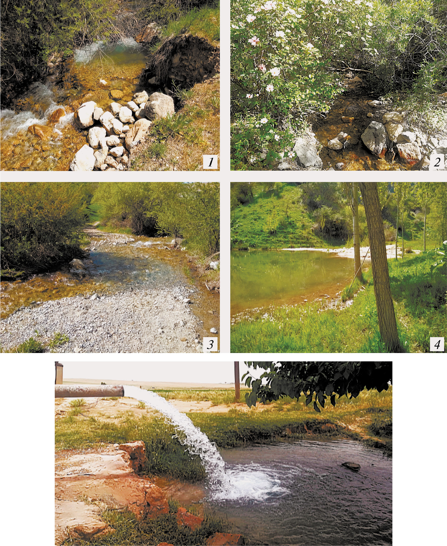 1 – горный сай, спускающийся со склона узкого ущелья, Китабский геологический национальный парк (39°11ʹ32.14ʺ N, 67°17ʹ34.01ʺ E, 1290 ± 4 м над ур. м., температура воды — 14 °С), 27.IV.2021; 2 – горный сай в узком ущелье, Сурханский государственный горнолесной заповедник (37°51ʹ30.42ʺ N, 66°38ʹ4.24ʺ E, 1676 ± 135 м над ур. м., температура воды — 13 оС), 28.V.2022; 3 – рукав сая, спускающийся со склона узкого ущелья, Китабский геологический национальный парк (39°11ʹ14.5ʺ N, 67°17ʹ36.71ʺ E, 1361 ± 10 м над ур. м., температура воды — 14 °С), 27.IV.2021; 4 – горная запруда, образованная от сая со склона широкого ущелья, Китабский р-н, ниже Китабского перевала (39°17ʹ25.87ʺ N, 66°54ʹ9.61ʺ E, 1615 ± 7 м над ур. м., температура воды — 10 °С), 26.IV.2021; 5 – яма-ко`панка для приема артезианской воды, поступающей из трубы, в горах на плоскогорье по дороге в Сурханский государственный горнолесной заповедник (37°43ʹ52.43ʺ N, 66°48ʹ4.79ʺ E, 853 м над ур. м., температура воды — 12 °С), 27.V.2022. Фото Н. И. Лебедевой
