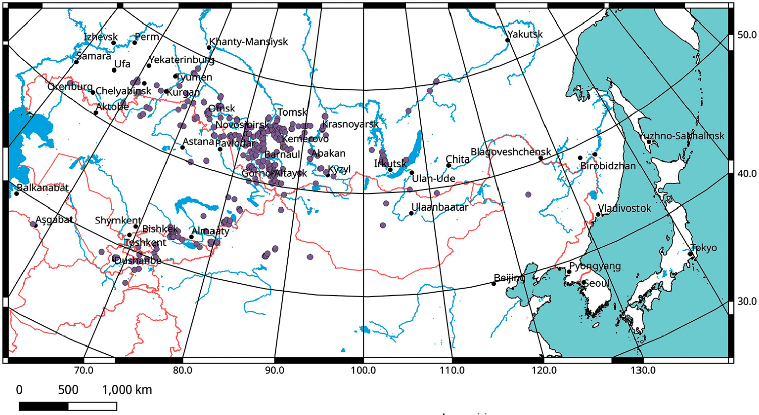 Публикация основана на оригинальных данных о распределении видов в разнообразных степных и лесостепных местообитаниях юга Сибири и сопредельных регионов, полученных в основном в 1976–2023 гг. с помощью методов, позволяющих оценить численность саранчовых: количественные учеты стандартным энтомологическим сачком за определенный промежуток времени с пересчетом на 1 ч (Gause, 1930; Сергеев, 1986; Sergeev, 2021) и определение плотности саранчовых на сериях площадок с разделением по видам (Бей-Биенко, 1932; Пшеницына и др., 1993). Для более полного анализа таксоценов подобные учеты обычно сопровождаются визуальными обследованиями местообитаний и качественными сборами. Для каждой точки определялись географические координаты, абсолютные высоты, описывалось состояние растительного покрова и почв. Проанализированы также материалы коллекционных фондов Новосибирского государственного университета, Института систематики и экологии животных СО РАН (Новосибирск), Зоологического института РАН (С.-Петербург) и Горно-Алтайского государственного университета (Горно-Алтайск), а также доступные публикации. Для определения географических координат точек учетов, проведенных до 2000 г., использовали пакеты Google Earth Pro 7.3.3 и ArcGIS Explore с уточнением при необходимости по доступным топографическим картам, последующей валидацией и переводом в десятичную форму.