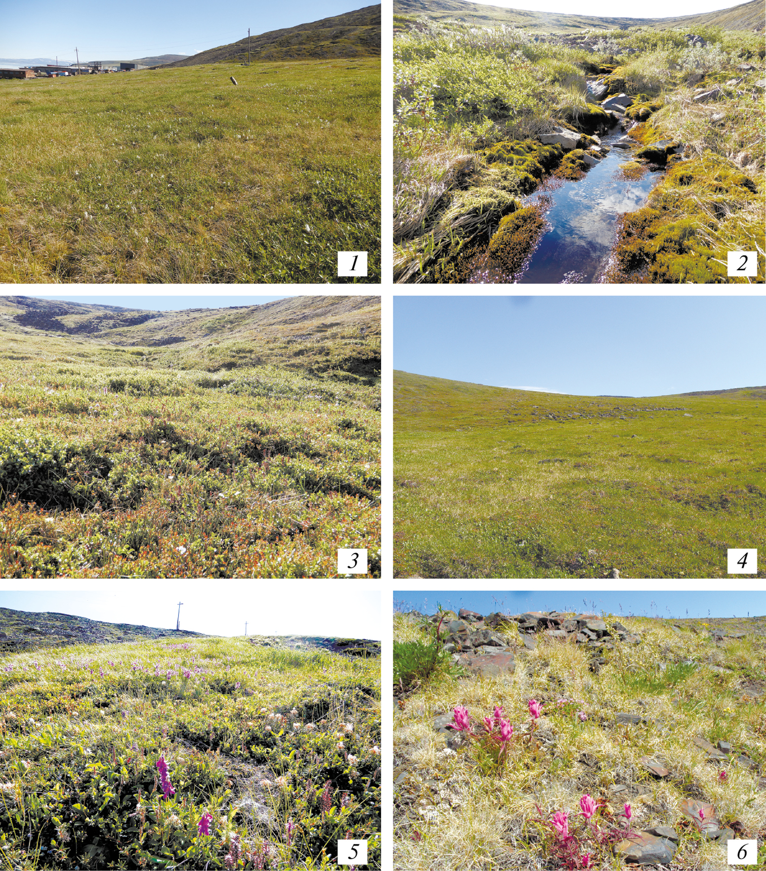 Рис. 3. Фотографии местообитаний северной оконечности сопки Пээкинэй. 1 — сырая депрессия на предгорном шлейфе, 2 — ручей в основании склона северной экспозиции, 3 — кустарничковая тундра в основании склона северной экспозиции, 4 — ложбина стока на склоне северо-западной экспозиции, 5 — нижняя часть склона юго-западной экспозиции со сплошным мохово-разнотравно-кустарничковым покровом, 6 — разнотравно-осочковая группировка на крутом склоне южной экспозиции.