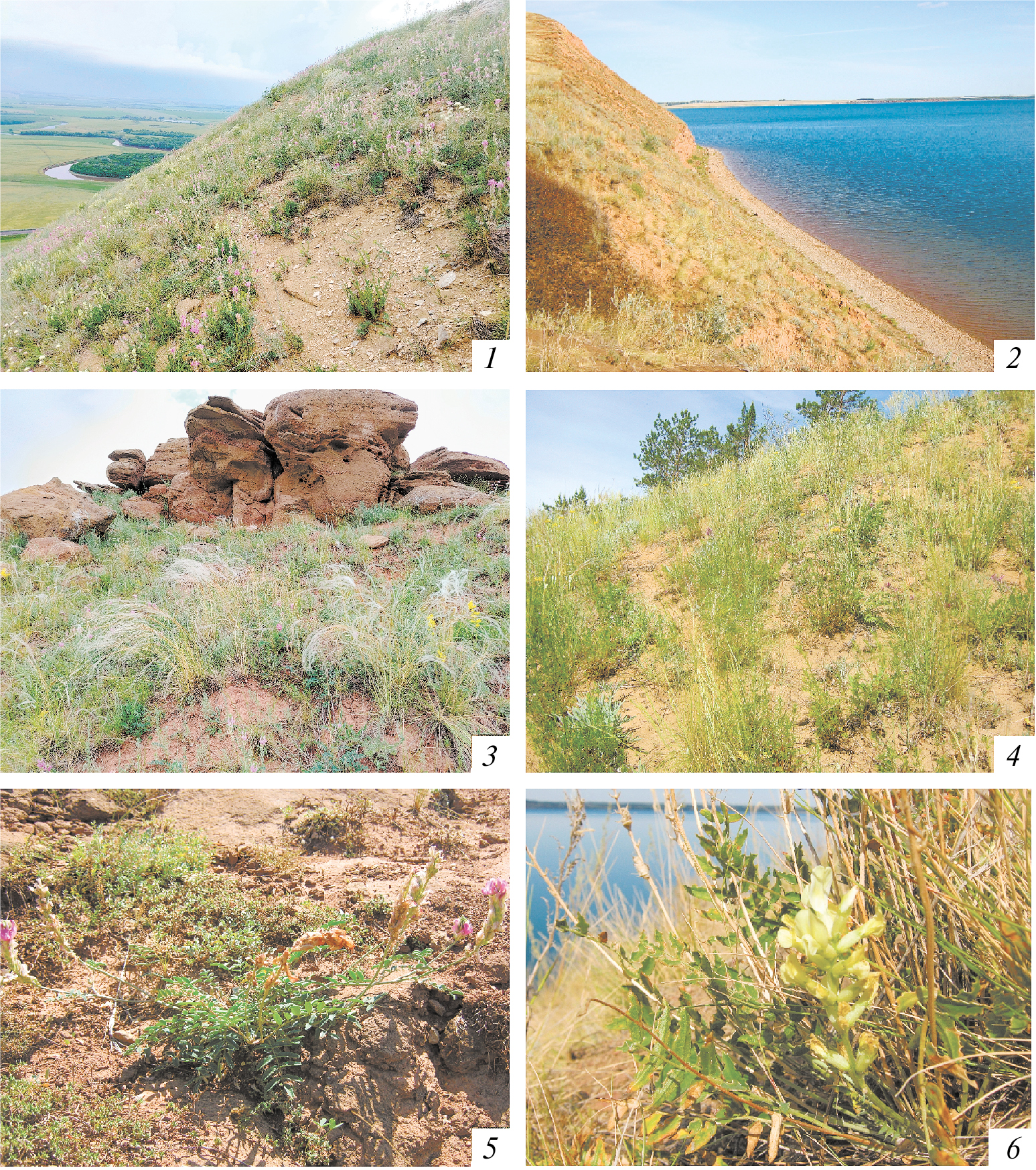 Рис. 2. Местообитания (1–4) и кормовые растения (5, 6) Sitona onerosus Faust. 1 — петрофитная склоновая степь на памятнике природы «Гора Сатыртау» (Башкирия); 2 — ксеротермные глинисто-песчаниковые склоны к оз. Аслыкуль (гора Нуртау в природном парке «Озеро Аслыкуль», Башкирия); 3 — песчаниковые обнажения у дер. Янги-Турмуш (природный парк «Озеро Аслыкуль», Башкирия); 4 — песчаная степь на склоне долины р. Волга (с. Федоровка, Самарская обл.); 5 — Hedysarum razoumowianum Fisch. et Helm ex DC.; 6 — Oxytropis hippolyti Boriss.; на листочках погрызы, оставленные жуками S. onerosus.