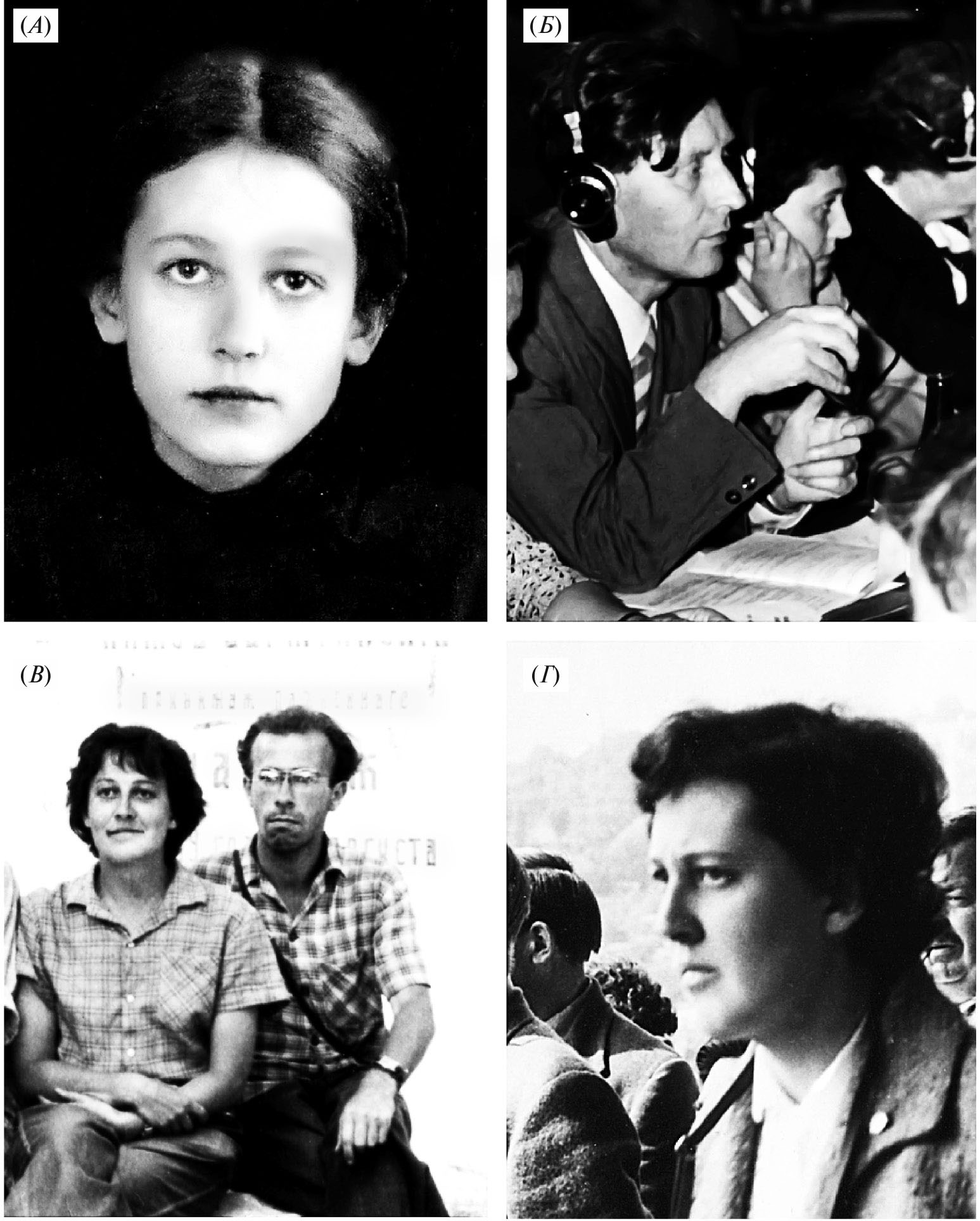 Рис. 1. Фотографии Елены Борисовны Виноградовой разных лет. А – Елена Виноградова – старшеклассница (начало 50-х гг. XX века); Б – А. С. Данилевский и Е. Б. Виноградова на конференции по фотопериодизму в Чехословакии (конец 60-х годов); В – Е. Б. Виноградова и В. А. Заславский – сотрудники лаборатории экспериментальной энтомологии ЗИН (70-е годы); Г – Е. Б. Виноградова на отчетной научной сессии ЗИН (80-е годы).
