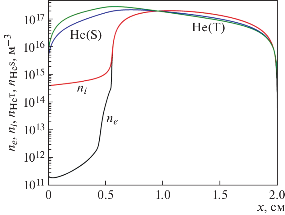 Представлены результаты численных исследований кинетики быстрых электронов и параметров плазмы в отрицательном свечении тлеющего разряда в гелии при низком давлении. Показано, что температура электронов в области отрицательного свечения является низкой и составляет десятые доли эВ. В рамках численных расчетов продемонстрировано формирование узких пиков на функции распределения электронов и зависимости дифференциального потока от энергии, связанных с быстрыми электронами, образовавшимися в реакциях пеннинговской ионизации. Результаты численных расчетов подтверждены результатами зондовой диагностики плазмы. Показана возможность определения концентрации возбужденных атомов гелия в плазме отрицательного свечения путем регистрации быстрых электронов, рожденных в результате реакций пеннинговской ионизации.