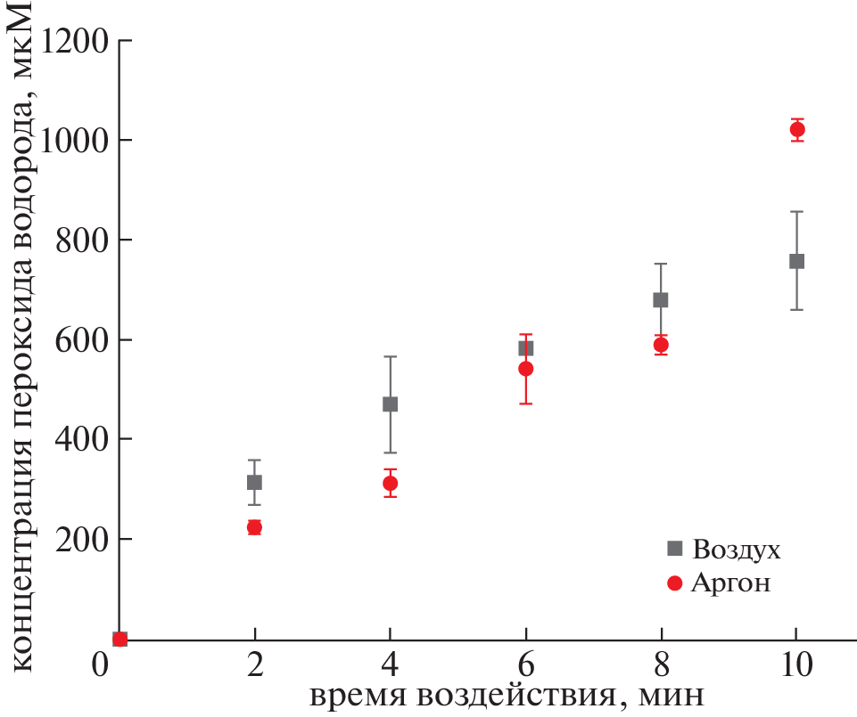 Представлены результаты исследований образования активных форм кислорода и азота в деионизированной воде Milli-Q® (электрическая проводимость ≤0.1 мкСм/см) под действием многоискрового импульсного разряда с инжекцией газа в межэлектродное пространство. Разряд представляет собой совокупность микроплазменных образований в многофазной среде, для которых был оценен удельный энерговклад. Проанализировано влияние инжектируемых газов (аргон, воздух) на образование плазменного разряда в межэлектродном пространстве и долгоживущих химических соединений: пероксида водорода, нитрит-ионов и нитрат-ионов. Изменение длительности воздействия на воду от 2 до 10 минут приводит к изменению ее химического состава и электропроводящих свойств, но практически не сказывается на характеристиках и длительности пробойной стадии разряда. При этом регистрировалось изменение концентраций пероксида водорода, нитрит-ионов и нитрат-ионов в течение одного часа после завершения плазменного воздействия. Обнаружено распыление электродов из нержавеющей стали, которое составило около 1 мг/минуту и приводило в ряде случаев к выпадению нерастворимого осадка. Полученные данные позволят провести оптимизацию воздействия активированной плазмой жидкости на растения и посадочный материал.