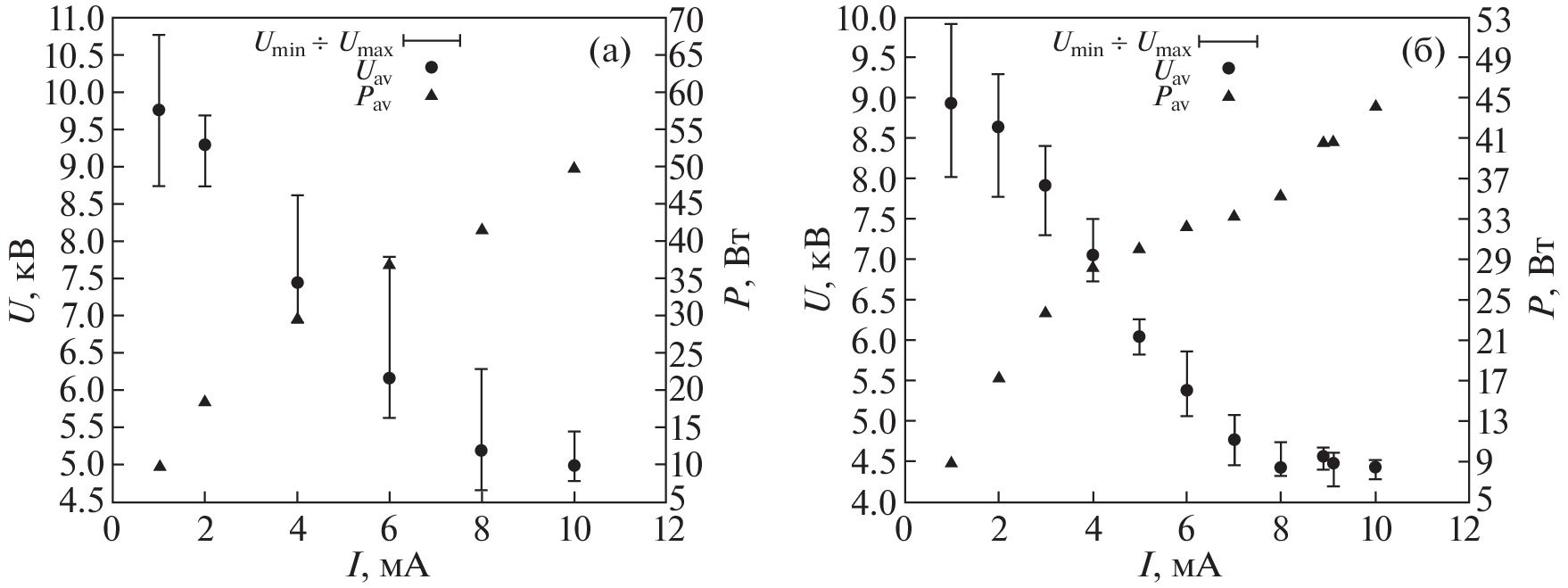 The joint impact of an electrical discharge and a gas–droplet flow of a conducting liquid created by a centrifugal nozzle is studied. In the experiment, the electrical parameters of the discharge are recorded, and the local characteristics of the spray, namely, the droplet diameter distributions of the number of droplets and the components of their velocity vector are measured. The measurements are carried out using double shadow microphotography. The effect of a spray of a conducting liquid on the time-averaged electrical parameters of the discharge, as well as changes in the properties of the spray under the influence of high voltage and current, are studied. Additionally, the spray characteristics are measured when a high voltage of pre-breakdown value is applied. High-speed photography of a discharge in the presence of droplets of conducting liquid is carried out.