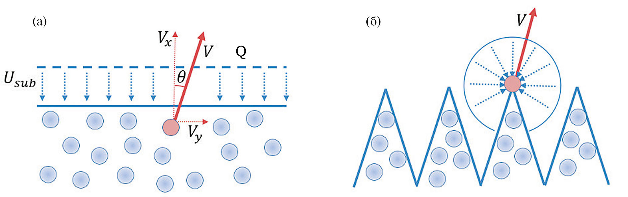 Модель потенциального барьера на границе твердое тело – вакуум [19] заметно влияет на результаты расчетов. Эта модель зависит от топографии поверхности (см. рис. 1). Для поверхности, состоящей из остриев атомного масштаба, поверхностный потенциал может быть принят изотропным (сферическим). В этом случае энергия распыленной частицы E2 должна быть больше энергии сублимации Es. Для гладкой поверхности используется модель плоскостного потенциала. В этом случае для распыленной частицы должно выполняться условие E2 · cos2(Θ) > Es, где Θ – угол вылета распыленной частицы, отсчитываемый от нормали к поверхности.