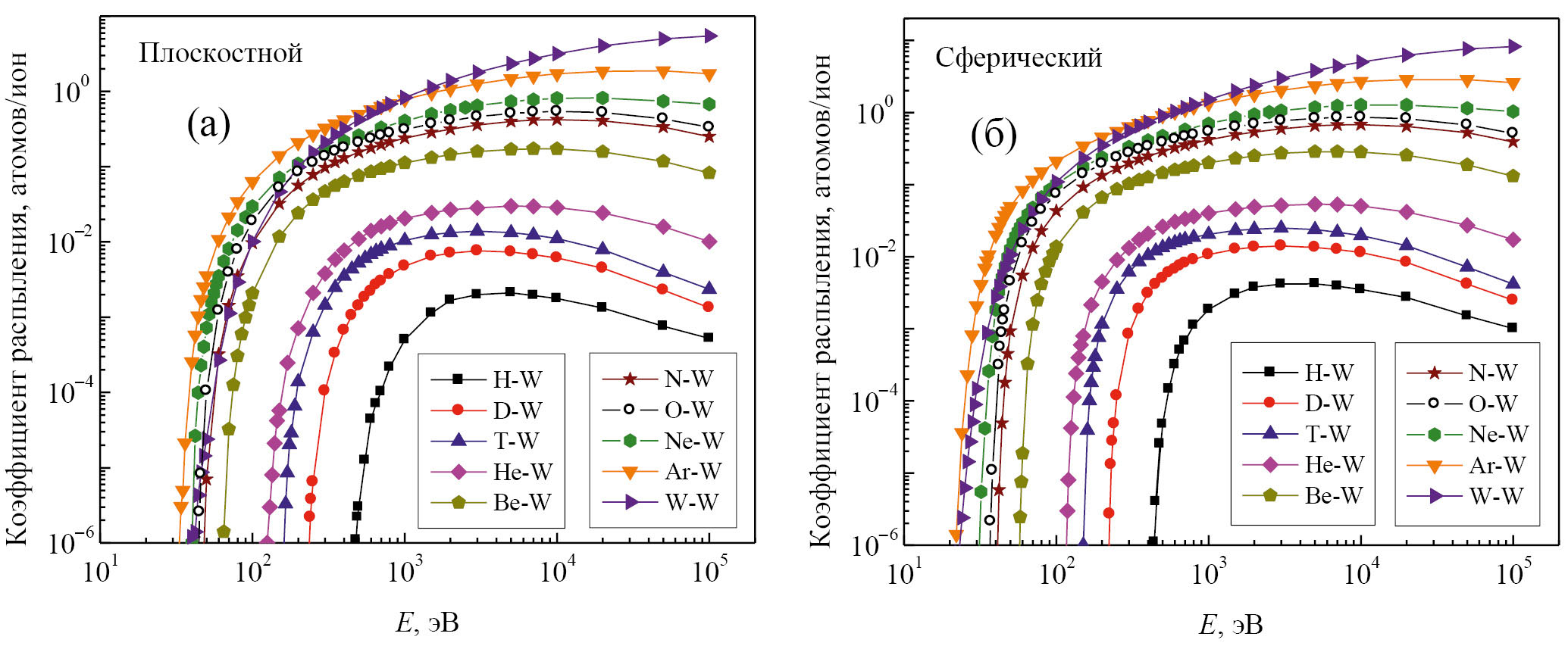 Электронная температура в районе сепаратрисы может составлять 100–150 эВ, электронная плотность – 1013 частиц/см3 [5]. При этих параметрах частицы примесей присутствуют в плазме в виде многозарядных ионов. При бомбардировке дивертора ионы примесей ускоряются потенциалом плазма-стенка, их энергия существенно увеличивается. Тем самым, ионы примесей могут вызвать значительно большее распыление дивертора, по сравнению с распылением водородными частицами. Таким образом, достоверная информация о коэффициентах распыления бериллия и вольфрама примесями важна для оценки работоспособности материалов, применяемых в токамаке ИТЭР.