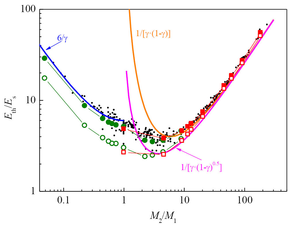 Рассмотрим случай M2 > M1. Механизм распыления потоком обратно рассеянных ионов в этом случае не работает. Переданная при первом столкновении энергия частицы отдачи Q = γ · E0. Затем частица отдачи летит вглубь твердого тела. Требуется хотя бы несколько столкновений частиц равной массы, чтобы произошел разворот траектории примерно на 90–180°. Как видно из рис. 4, эмпирическая зависимость Eth /Es= 6/γ неплохо описывает данные для случая M2 /M1<1.
