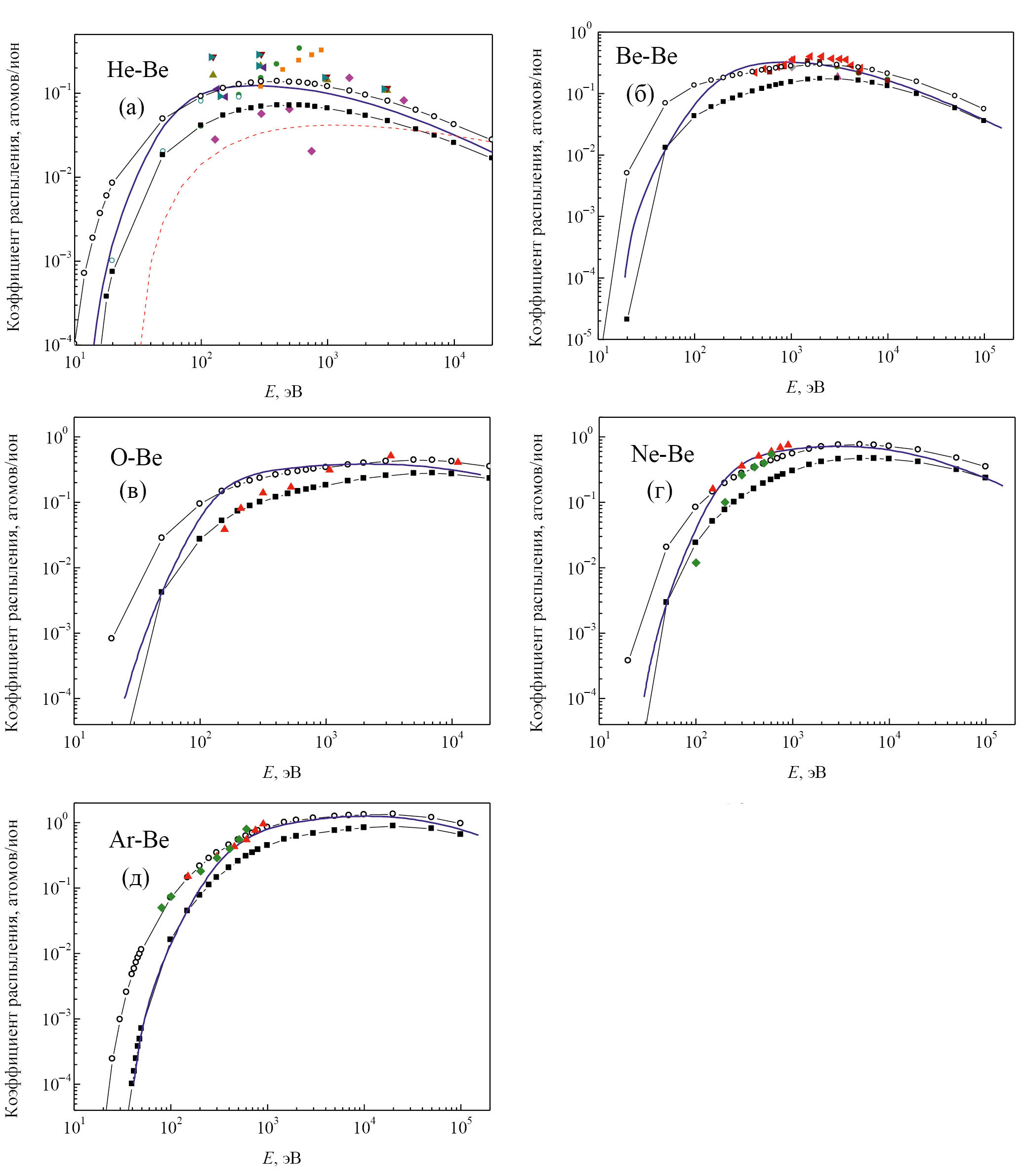 Рис. 5. Коэффициент распыления мишени из бериллия атомами: (а) He, (б) Be, (в) O, (г) Ne, (д) Ar в зависимости от энергии бомбардирующих частиц. Наш расчет: для плоского барьера – линия с квадратами, для сферического барьера – линия с кружками. Синяя сплошная линия – расчет группы Экштайна [7]. Точки – результаты экспериментальных работ, приведенных в монографии [6]. На рис. 5a штриховой линией показан расчет по формуле (2) [19]