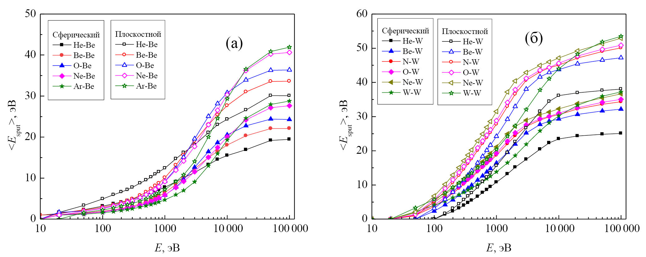 Рис. 7. Зависимость средней энергии распыленного атома от начальной энергии бомбардирующей частицы при облучении различными атомами: (а) – мишень из Be, (б) – мишень из W. Сплошные точки – плоскостной поверхностный барьер, открытые точки – сферический барьер