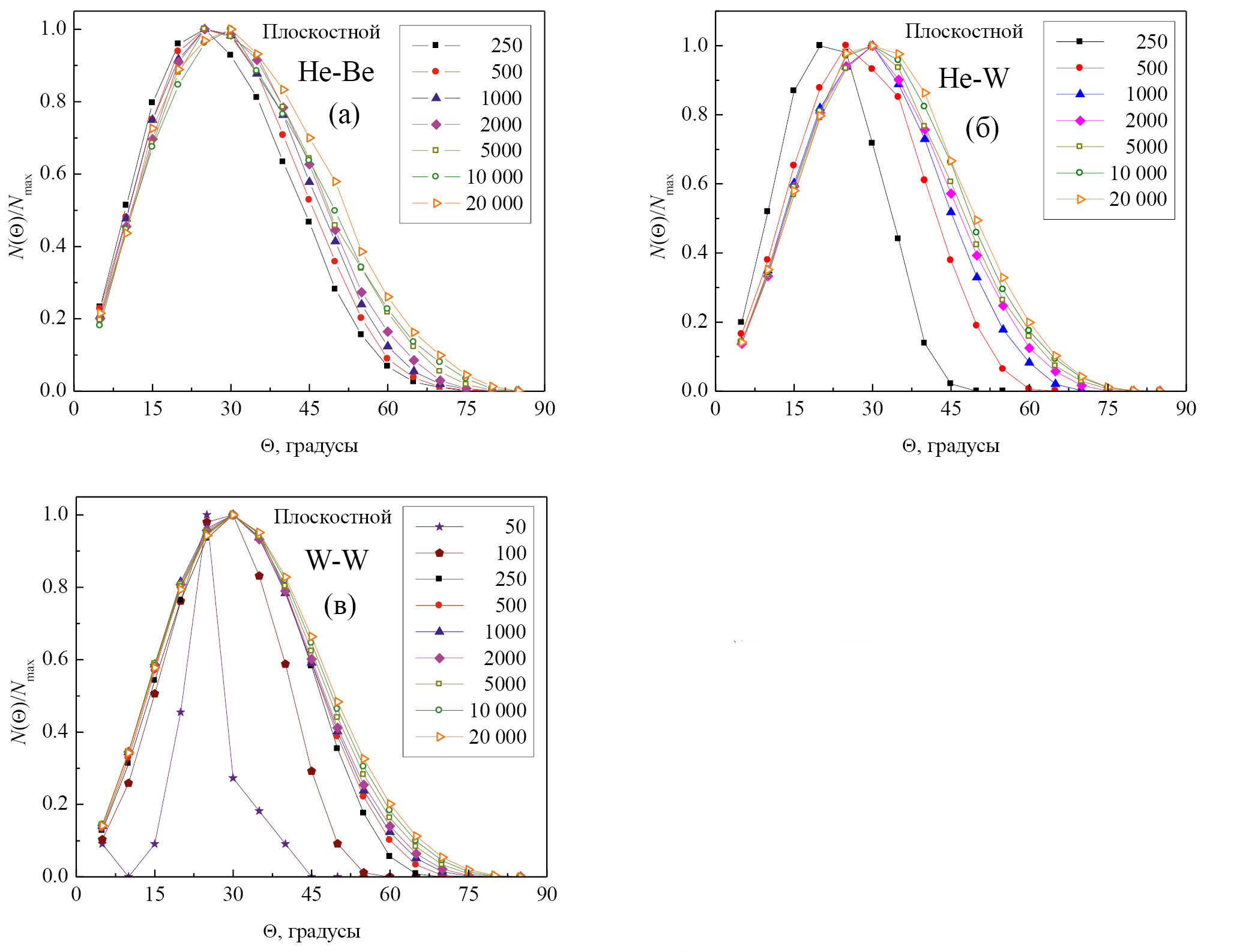 Рис. 9. Нормированные угловые зависимости распыленных частиц для случая плоскостного потенциального поверхностного барьера: (а) случай He-Be; (б) случай He-W; (в) случай W-W