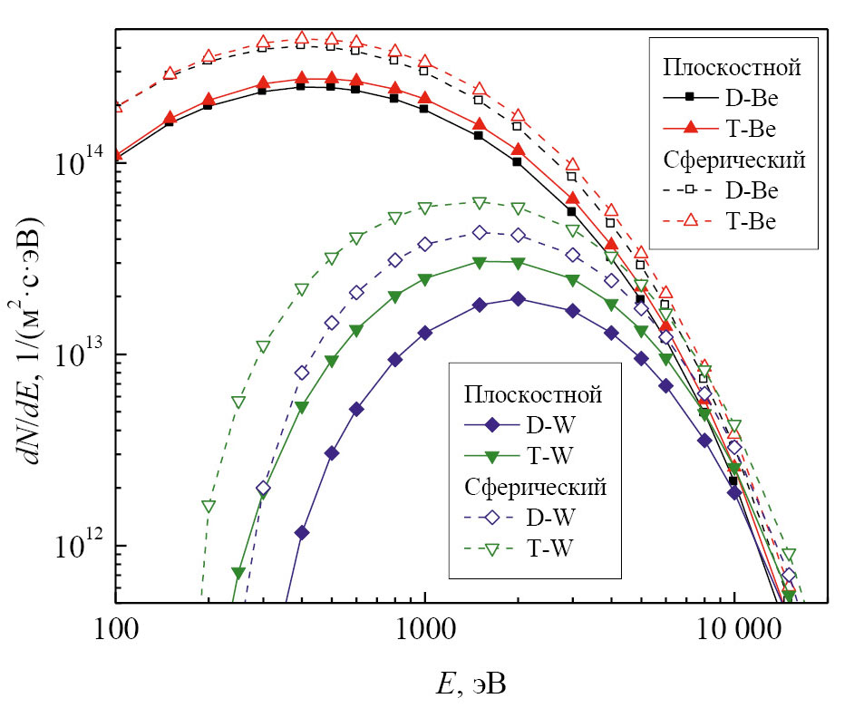 На рис. 11 представлены энергетические спектры dN/dE атомов дейтерия и трития, бомбардирующих первую стенку токамака, полученные с помощью программы DOUBLE-MC в работе [4]. Видно, что спектр содержит частицы в широком диапазоне энергий, а максимум распределения лежит в районе 1 кэВ. При увеличении угла θn увеличивается интенсивность потока атомов, покидающих плазму, и спектр смещается в сторону меньших энергий.