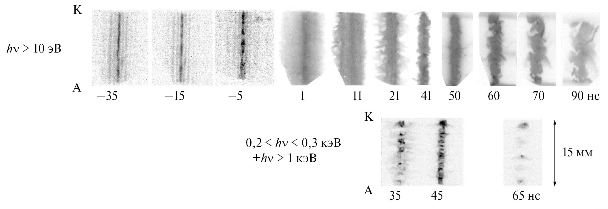 На рис. 3 приведена серия последовательных изображений плазмы, полученных с помощью рентгеновских ЭОПов, на которых время, указанное под снимками, отсчитывается от максимума тока. Из рентгеновских фотографий, полученных в области hν ≥ 10 эВ, видно, что на “–35” нс формируется светящийся столбик диаметром 4 мм с ярким шнуром диаметром менее 1 мм на оси, которые подсвечивают еще не испарившиеся остовы проволочек сборки. Такая оболочечная структура образуется в результате прихода относительно горячей плазмы предвестника на ось сборки. На следующих рентгеновских фотографиях видно, что к максимуму тока интенсивность свечения шнура увеличивается за счет радиального сноса плазмы к оси. При этом через 11 нс после максимума тока образуется светящийся цилиндр с диаметром 6 мм, равным диаметру внутренней сборки лайнера. Дальнейшее ускорение сборки к оси заканчивается образованием на ее оси пинча с минимальным диаметром менее 1 мм.