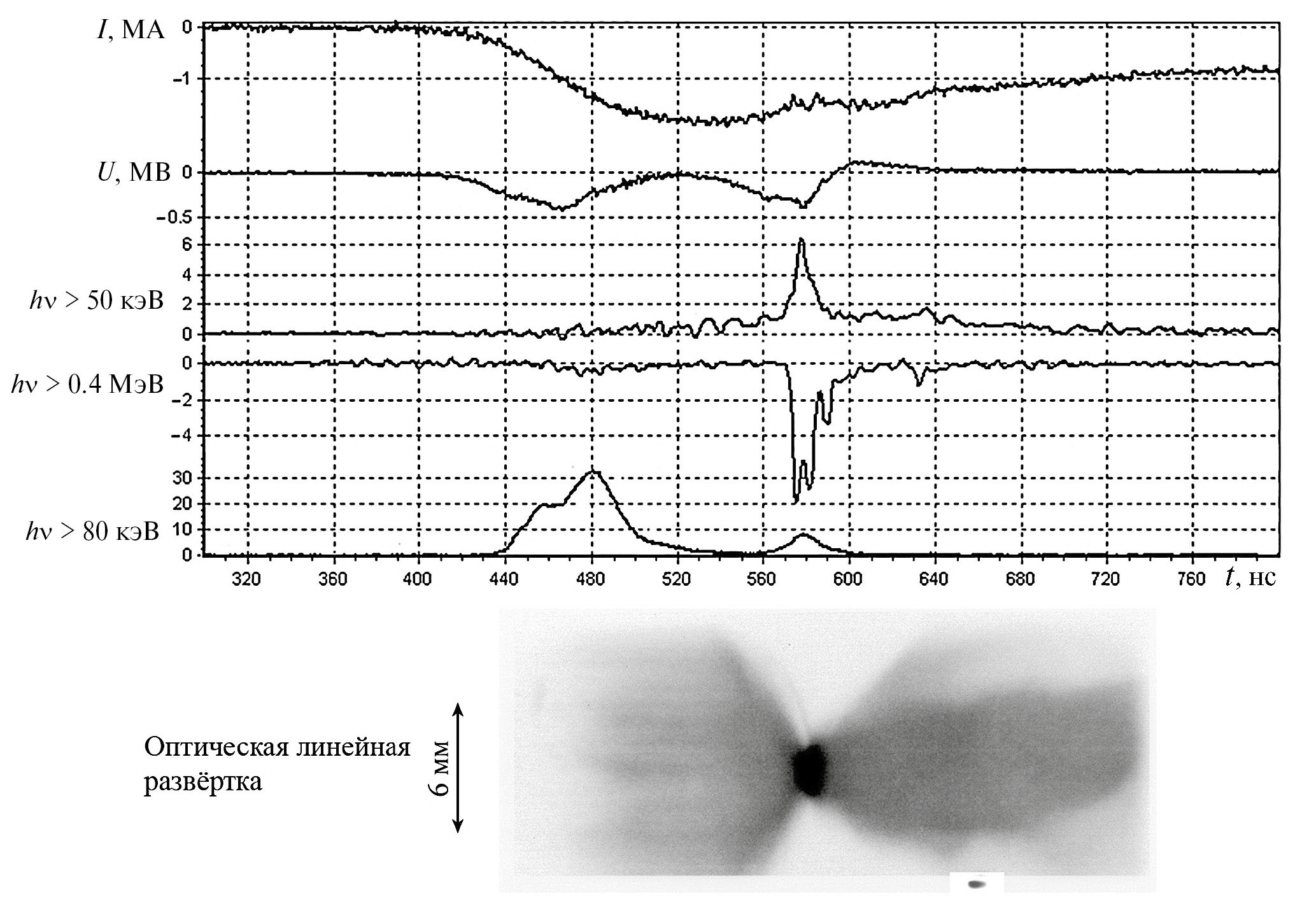 Рис. 2. Пуск 06.06 № 2. Осциллограммы тока I [МА]; напряжения U [МВ]; импульсов сверхжёсткого рентгеновского излучения в условных диапазонах hν > 600 кэВ и hν > 400 кэВ; жёсткого рентгеновского излучения в диапазоне hν > 80 кэВ; мягкого рентгеновского излучения с энергией 10 < hν < 6000 эВ, и хронограмма сжатия многопроволочной сборки в видимом свете. Мощность излучения представлена в относительных единицах