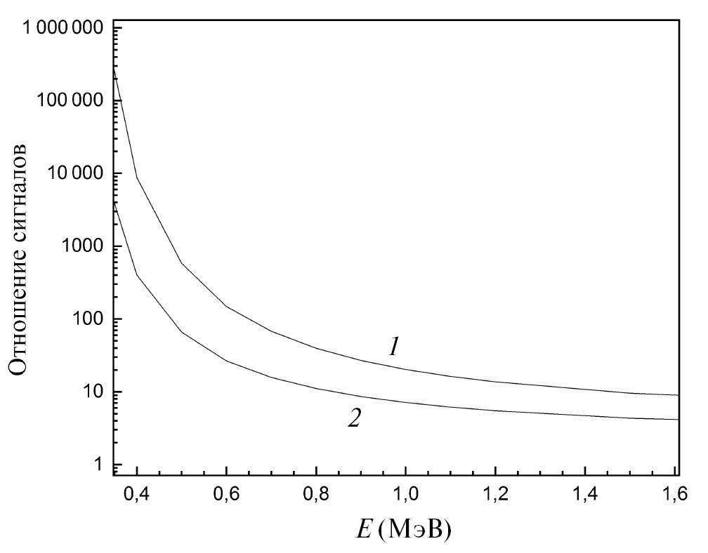 Рис. 7. Расчетные отношения сигналов ФЭУ, экранированных свинцовыми фильтрами толщиной 2 см и 5 см — 1 и фильтрами толщиной 3 см и 5 см — 2, в зависимости от энергии электронов